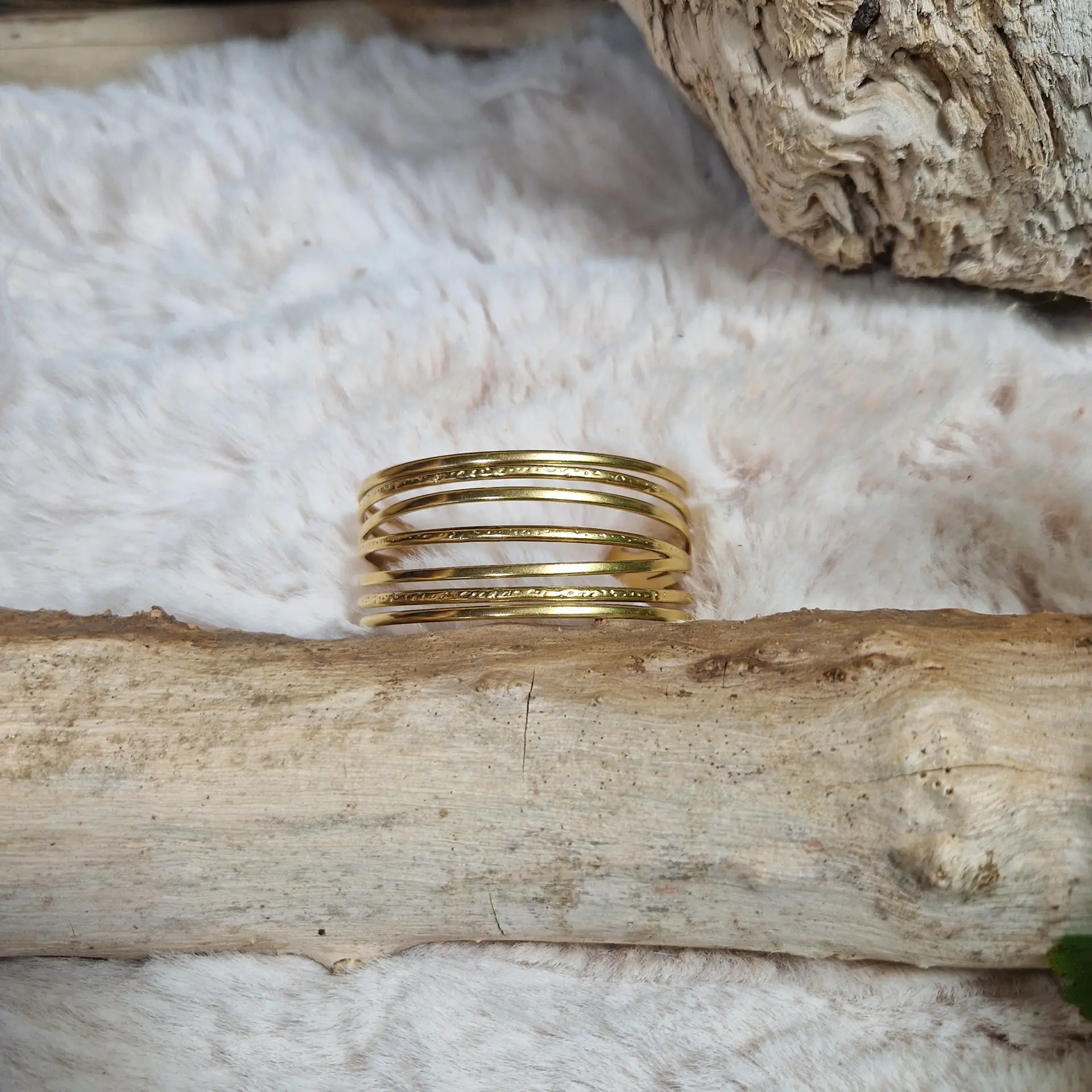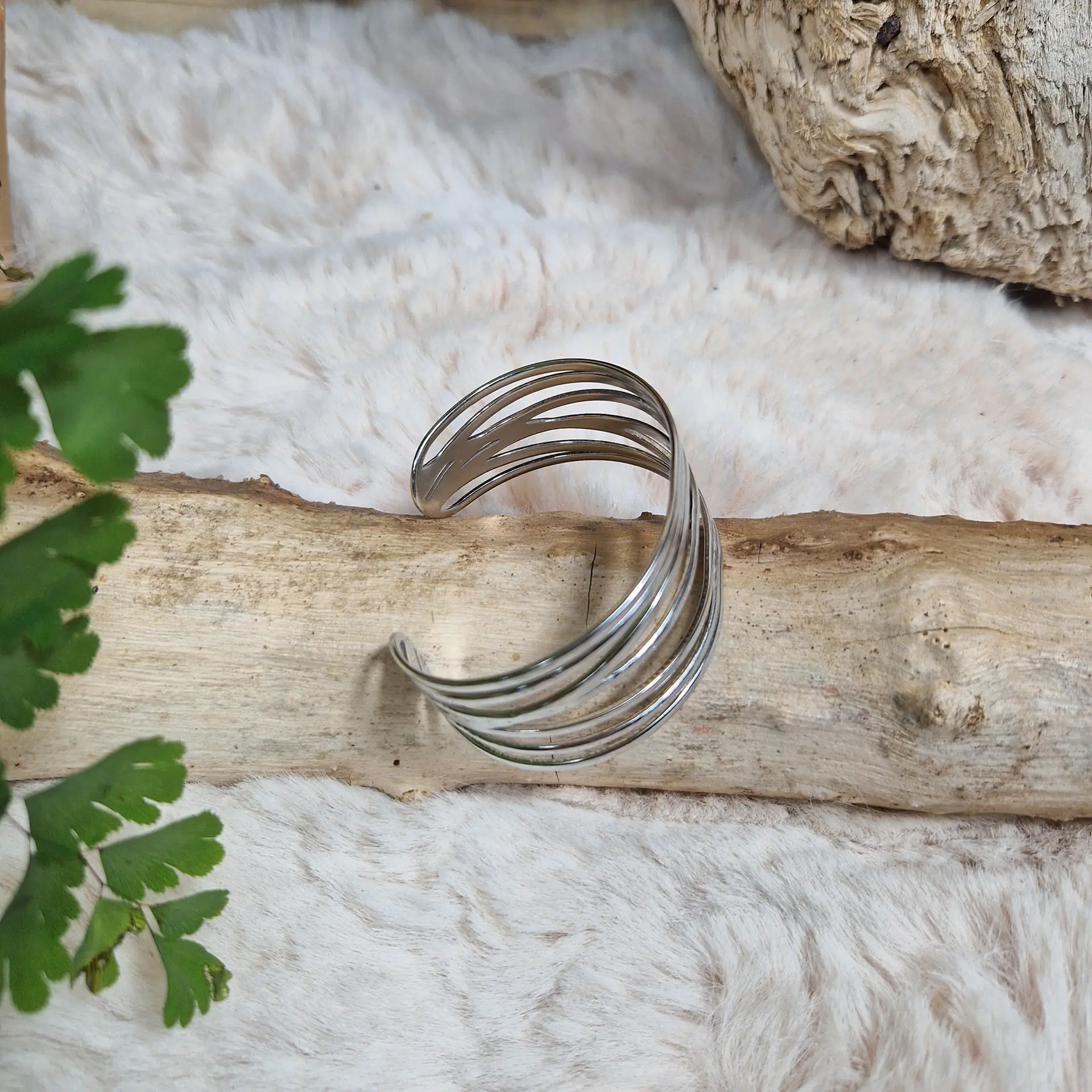 Élégant et moderne, ce bracelet manchette en acier inoxydable se compose de plusieurs rangs entrelacés aux fines gravures texturées. Résistant, ajustable et intemporel.