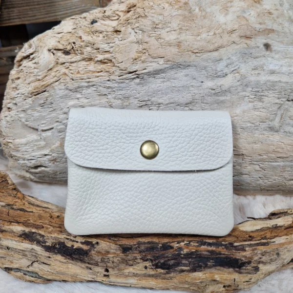 – Porte-monnaie : Alliez style et fonctionnalité avec ce porte-monnaie en cuir blanc. Son compartiment principal se ferme par un bouton pression, tandis qu’une poche zippée sécurise vos pièces et petits objets. Porte-monnaie en cuir grainé finition pigmentée. Cuir de bovin. Pas de doublure. Cuir de fabrication italienne.