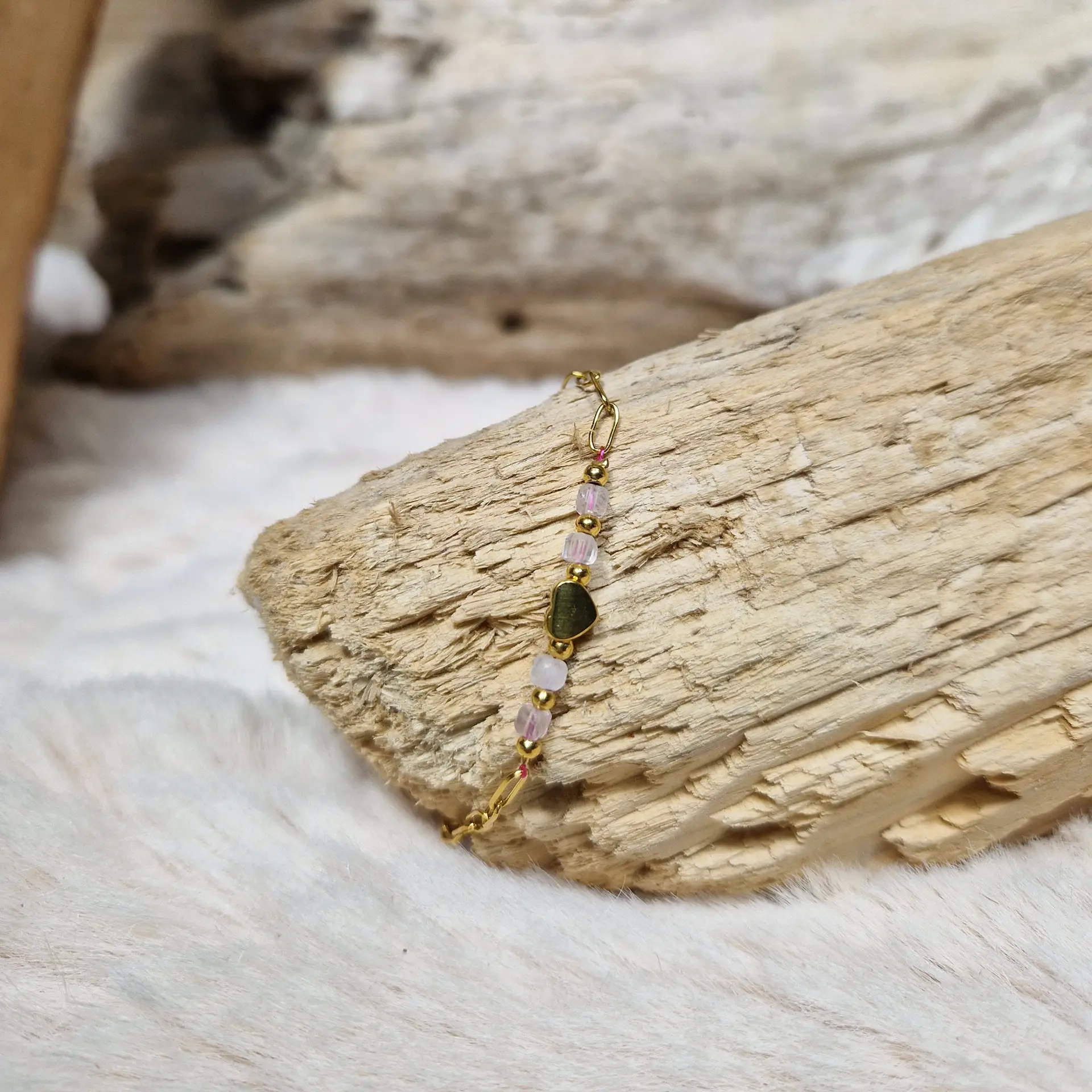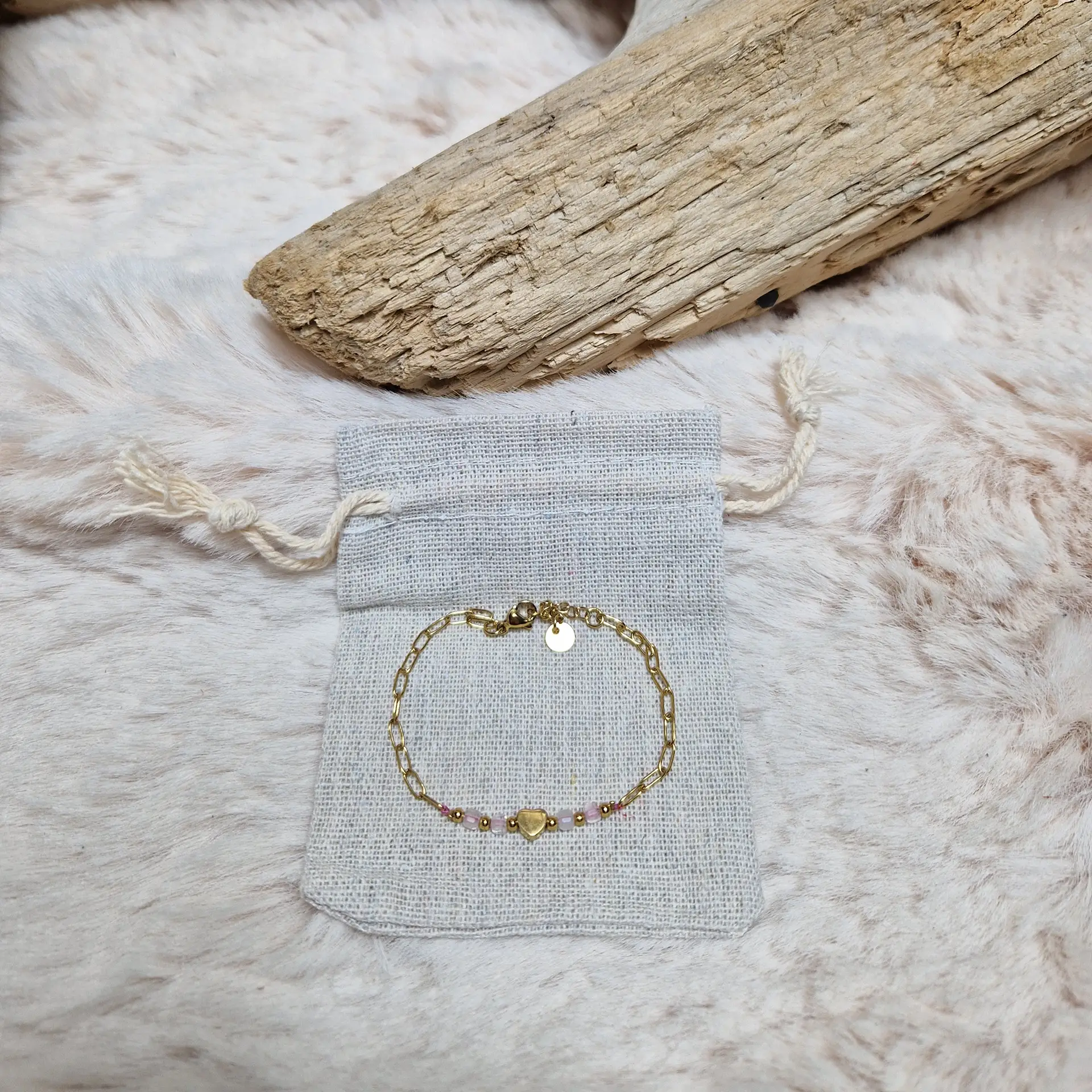 – Bracelet : Ce bracelet doré fin et élégant orné de petites pierres naturelles et d’un petit cœur, idéal pour un look intemporel. Bracelet en acier inoxydable.