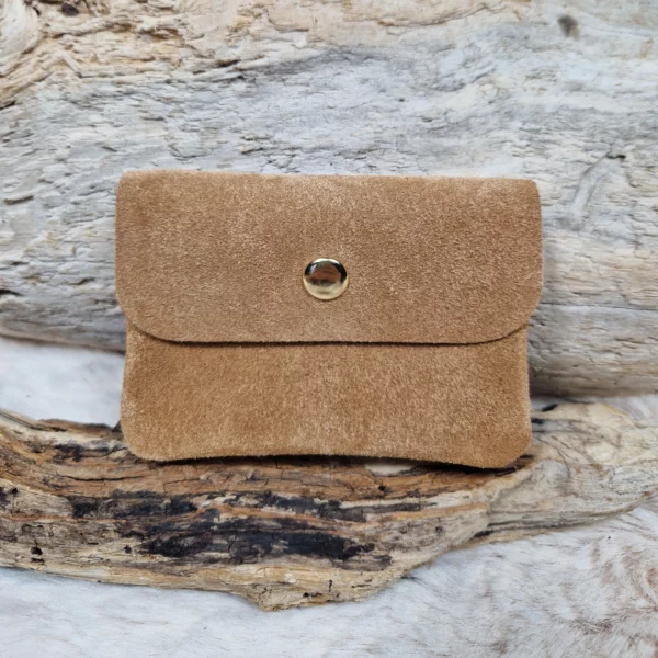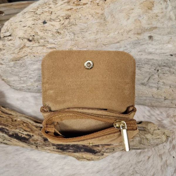 – Porte-monnaie : Alliez style et fonctionnalité avec ce porte-monnaie en cuir velours de couleur camel. Son compartiment principal se ferme par un bouton pression, tandis qu’une poche zippée sécurise vos pièces et petits objets. Porte-monnaie en croûte de cuir finition velours. Cuir de bovin. Pas de doublure. Cuir de fabrication italienne.