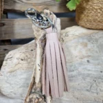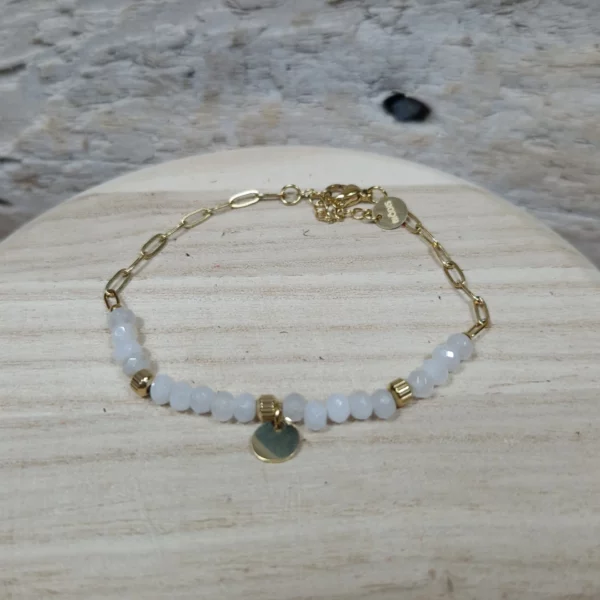 – Porte-clés : Apportez une touche d’élégance et d’originalité à vos clés, sacs ou accessoires avec ce porte-clés pompon en cuir grainé rose clair. Porte-clés en cuir grainé finition pigmenté. Cuir de bovin. Cuir de fabrication italienne. Crochet et anneau en métal de couleur argenté. – Bracelet : Ce bracelet doré fin et élégant orné de petites pierres blanches naturelles est idéal pour un look intemporel. Bracelet en acier inoxydable.