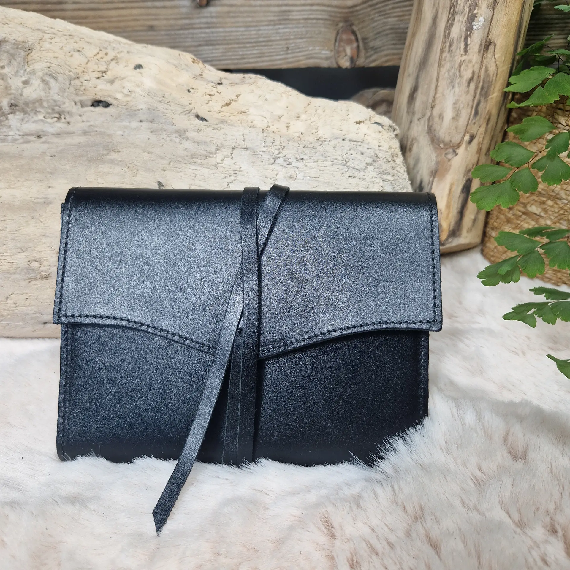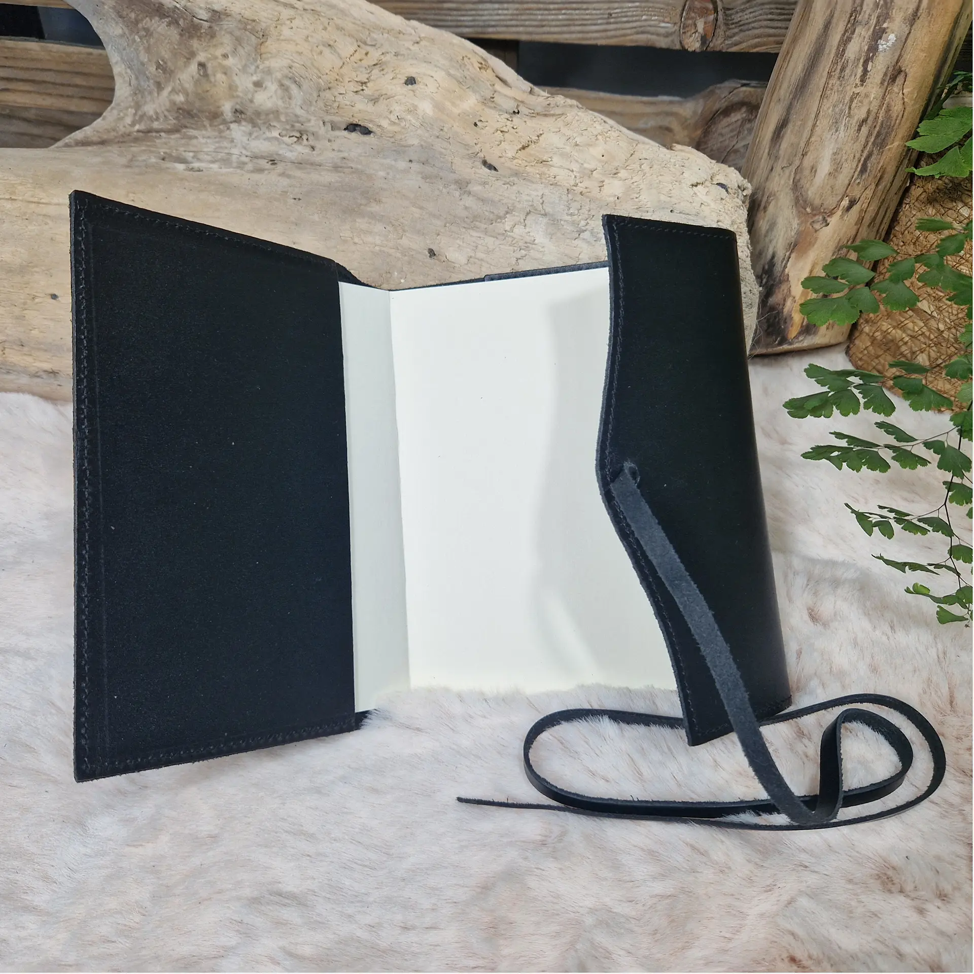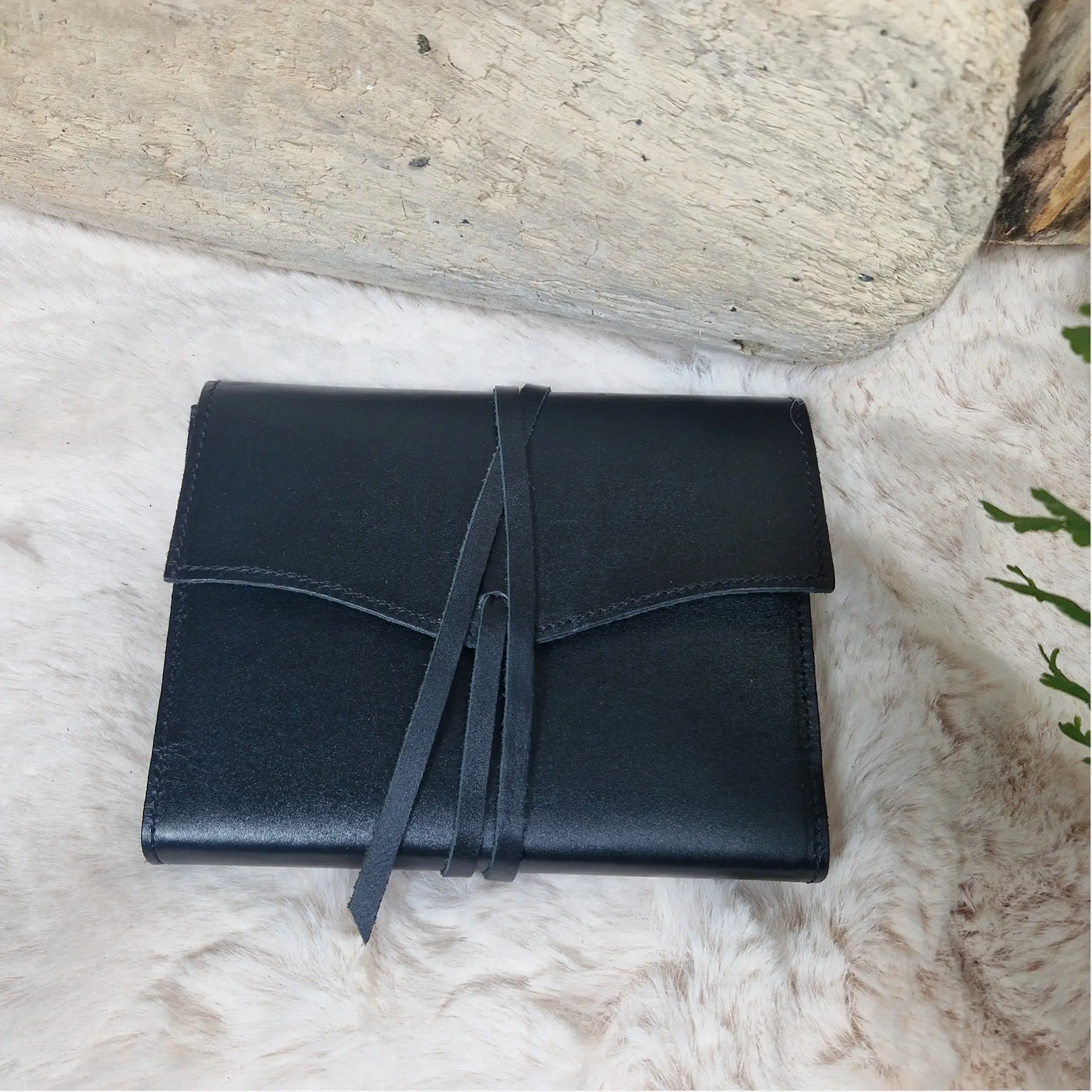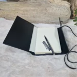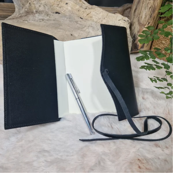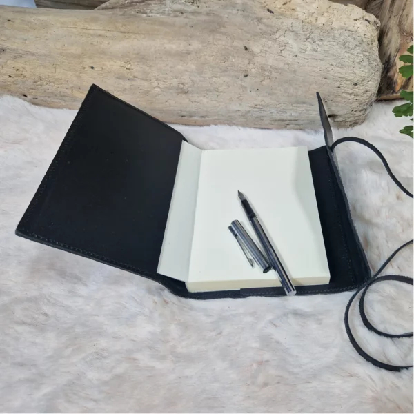 Étui en cuir noir pour carnet, sobre et élégant. Intérieur doux, fermeture par lanière en cuir à enrouler. Idéal pour protéger et transporter un carnet, un agenda ou un bloc-notes avec style.