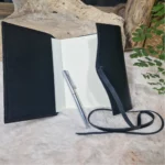 Étui en cuir lisse de couleur noire, élégant et sobre, conçu pour protéger et transporter un petit carnet ou un bloc-notes. L’intérieur est le côté velours du cuir offrant une finition douce et soignée. Le carnet se glisse dans une poche prévue à cet effet qui le maintient à l’intérieur de l’étui. Une lanière en cuir longue et fine est fixée sur le rabat permettant de fermer et sécuriser l’étui en l’enroulant autour. L’ensemble allie praticité et raffinement, idéal pour protéger un carnet de notes, un journal ou un agenda, tout en offrant une présentation élégante. Étui en cuir fleur corrigée finition pigmentée. Cuir de bovin. Pas de doublure. Cuir de fabrication italienne. Dimensions du carnet intérieur 12 x 16,5 cm.