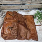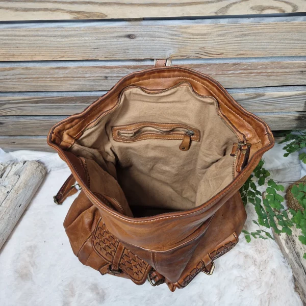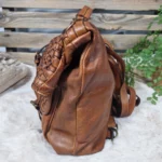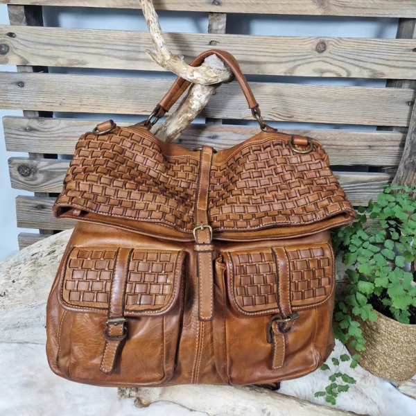 Superbe sac en cuir souple marron vieilli, modèle convertible (main, épaule ou sac à dos), avec un grand compartiment intérieur et deux poches extérieures à boucles. Style unique avec tressage artisanal. Idéal pour le quotidien ou les voyages, il est pratique, élégant et robuste.