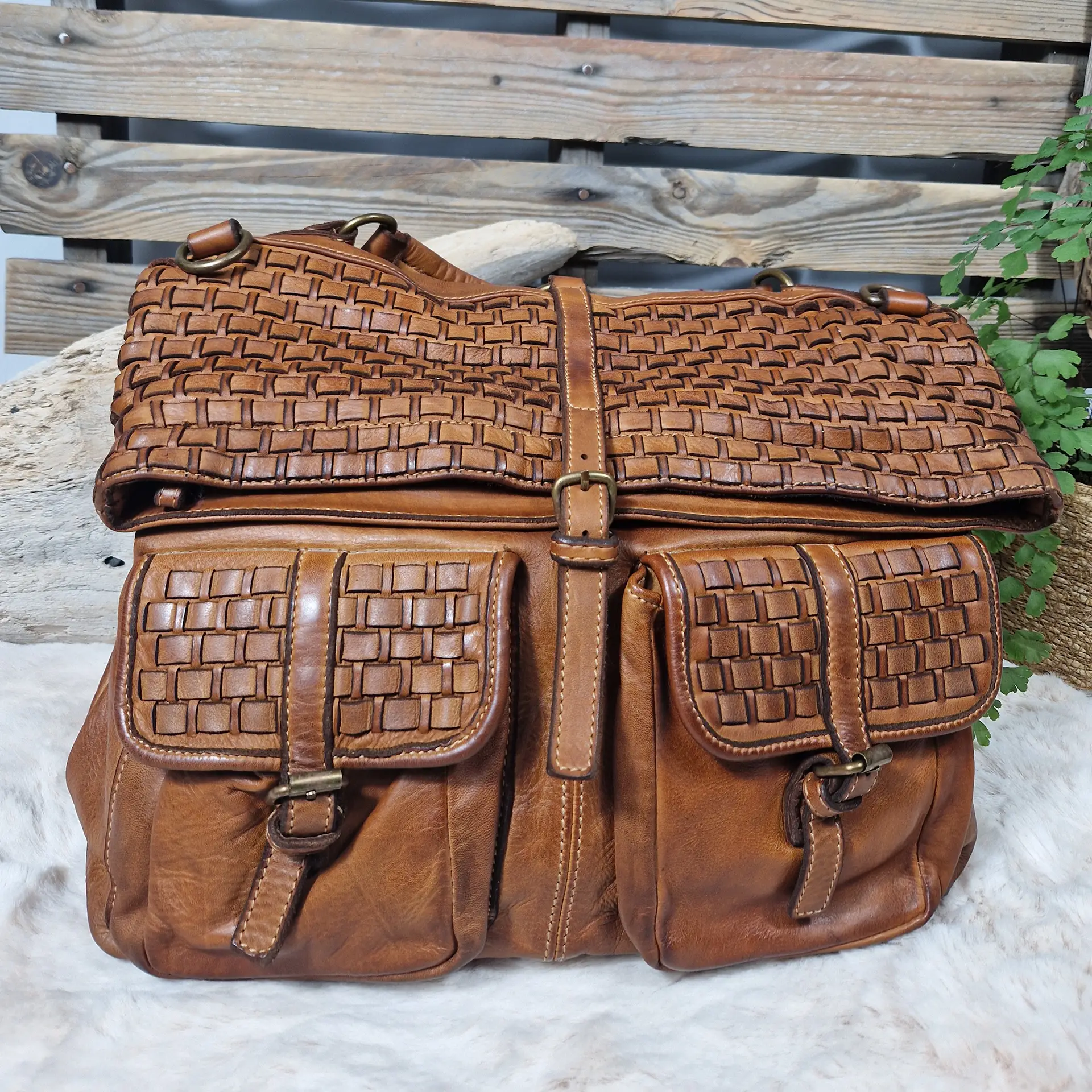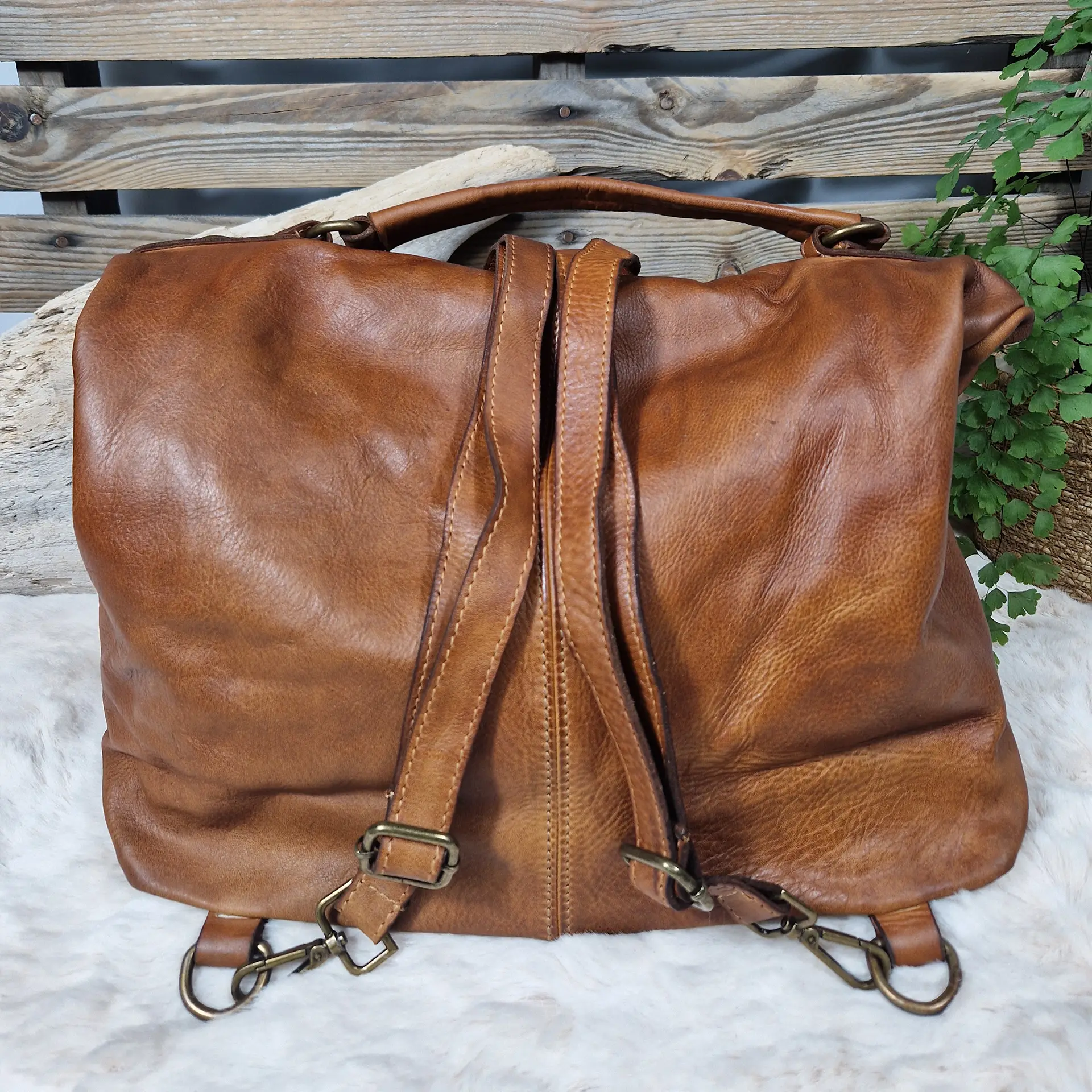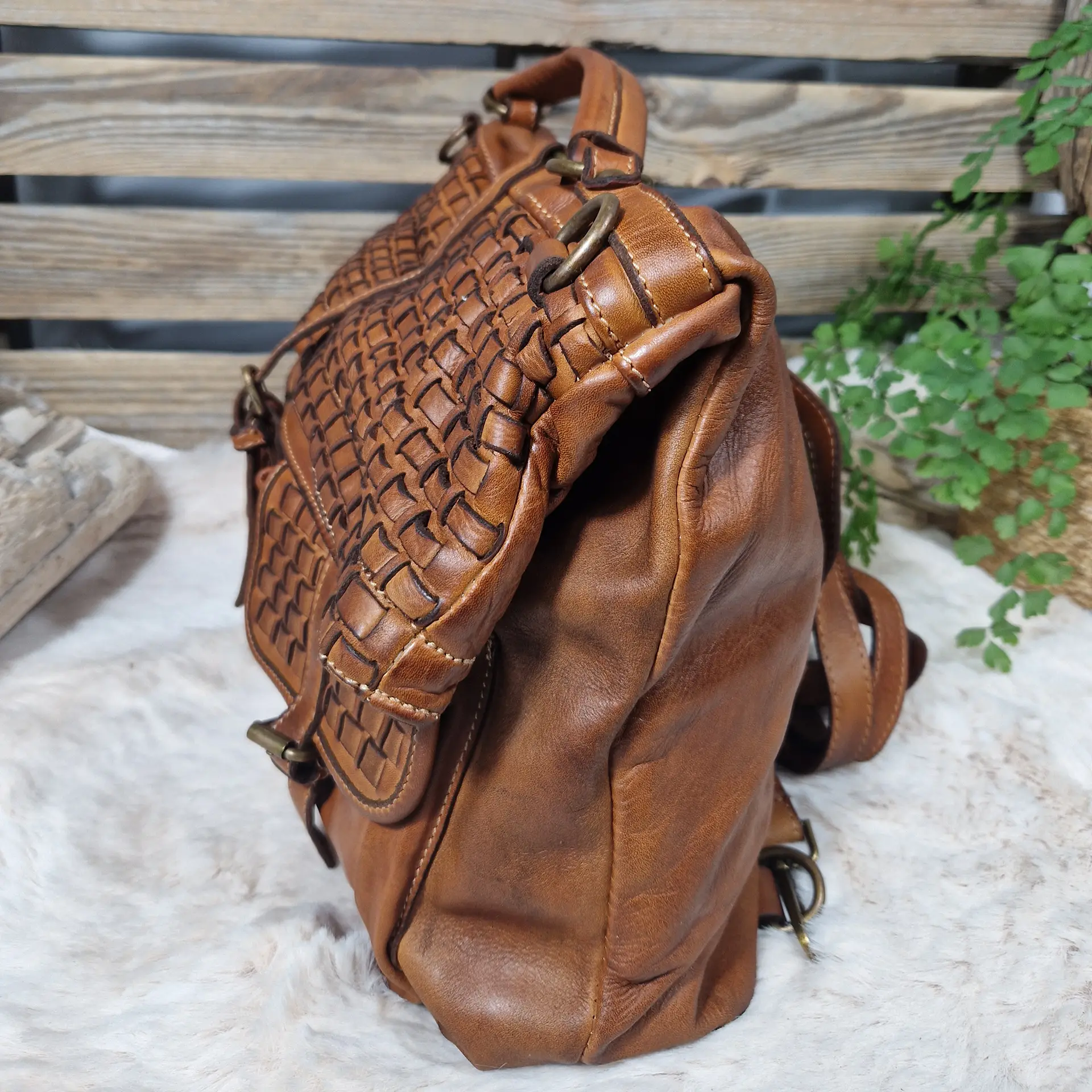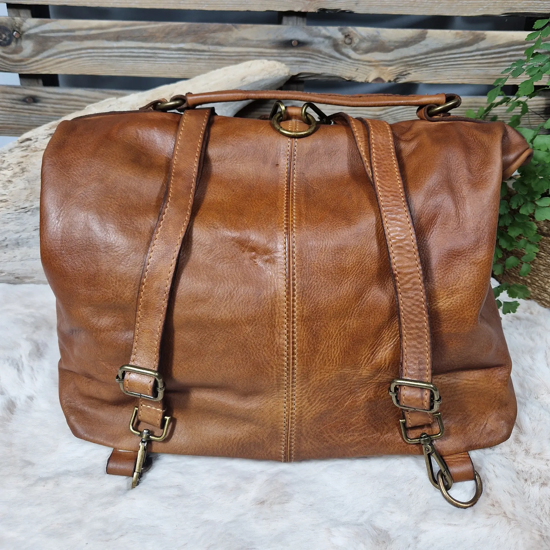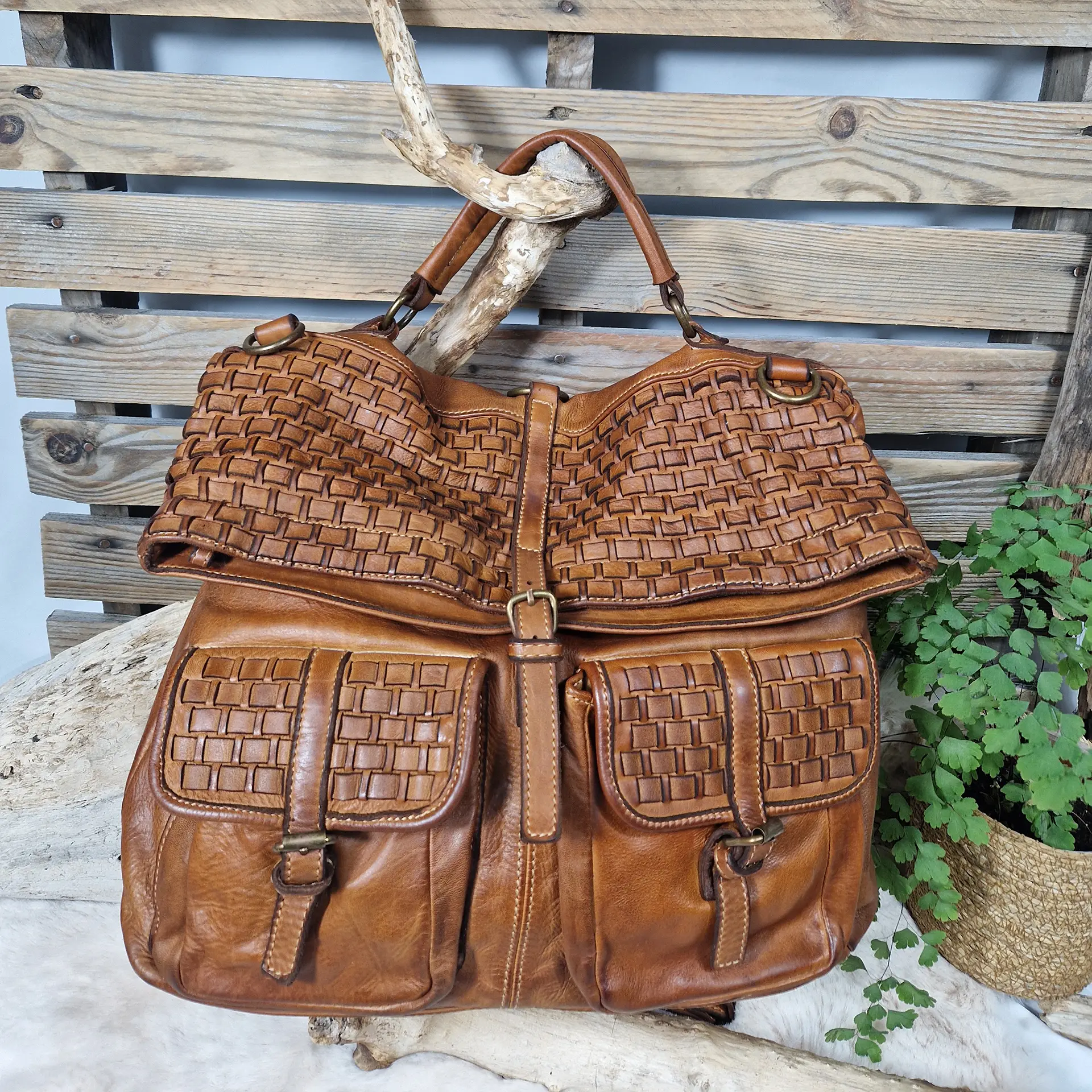 Superbe sac en cuir souple marron vieilli, modèle convertible (main, épaule ou sac à dos), avec un grand compartiment intérieur et deux poches extérieures à boucles. Style unique avec tressage artisanal. Idéal pour le quotidien ou les voyages, il est pratique, élégant et robuste.
