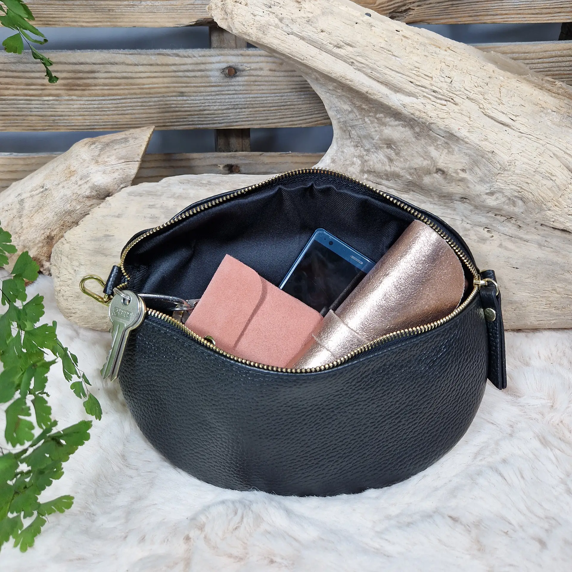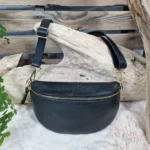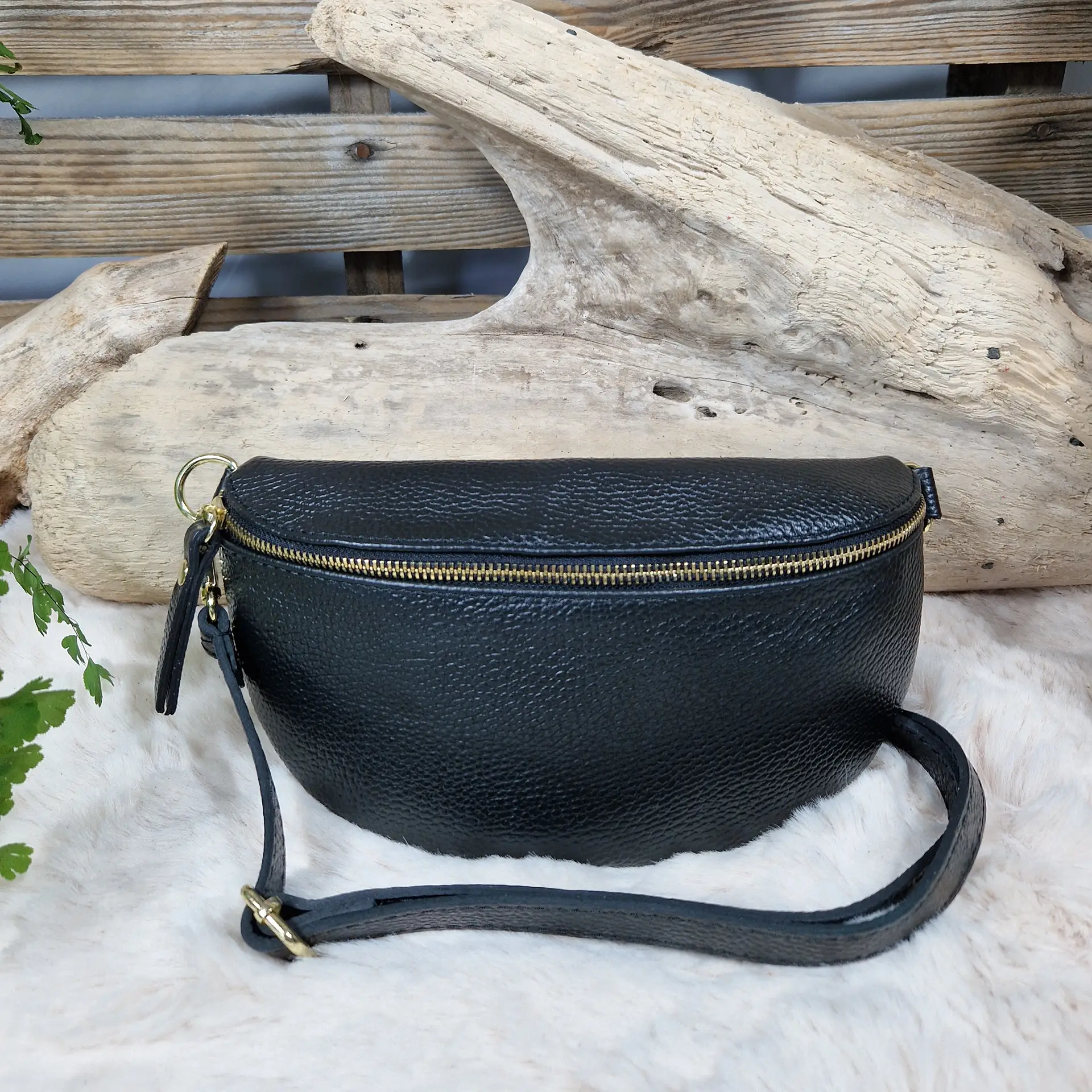 Sac banane en cuir grainé au design élégant avec fermeture éclair dorée et sangle ajustable, parfait pour un look pratique et élégant.