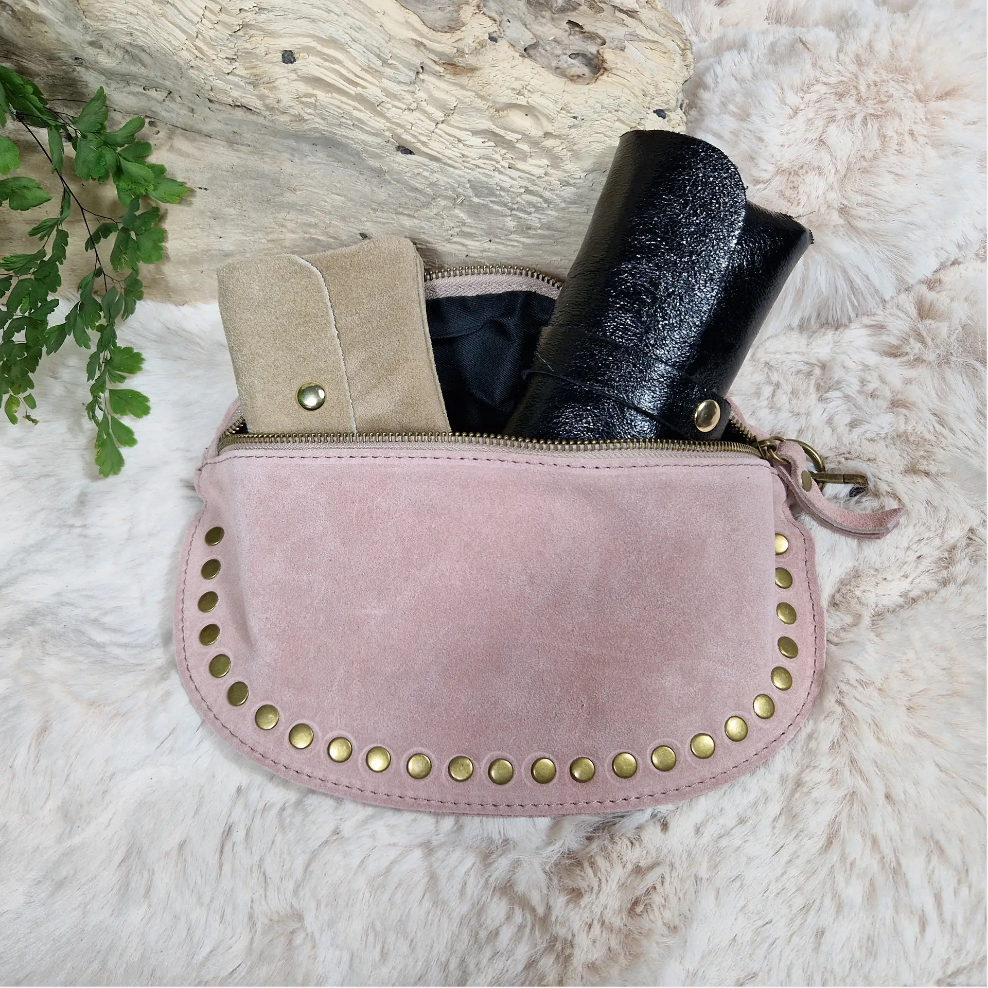 Ce sac banane en croûte de cuir velours avec détails cloutés apporte une touche d’élégance décontractée à vos tenues. Sa texture douce s’associe à un design arrondi et raffiné, rehaussé de rivets métalliques vieillis qui soulignent son caractère moderne et tendance. Pratique et stylé, il dispose d’une fermeture zippée sécurisée ainsi qu’une bandoulière ajustable en cuir assorti pour un porté confortable. Son compartiment intérieur possède une petite poche zippée plaquée. Un accessoire chic et compact, idéal pour accueillir vos essentiels du quotidien avec style, parfait pour accompagner tous vos looks. Sac en croûte de cuir finition velours. Cuir de bovin. Doublure intérieure en polyamide. Cuir de fabrication italienne.