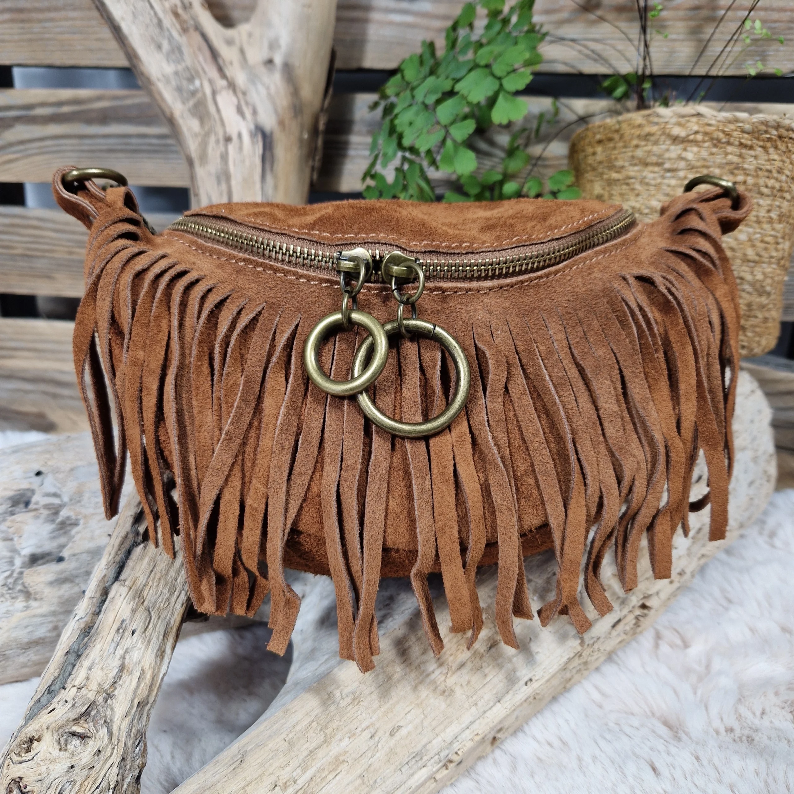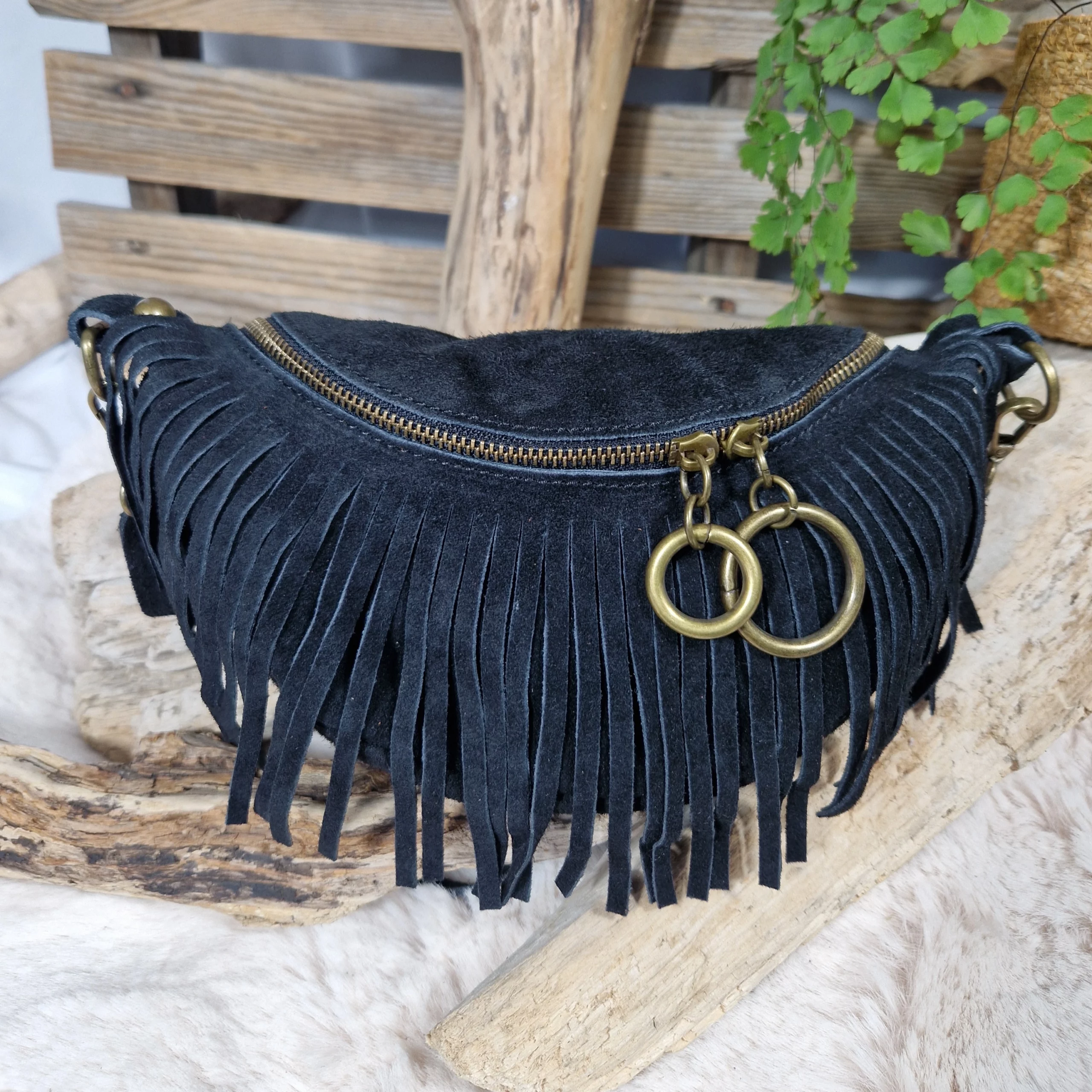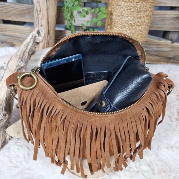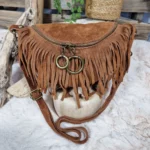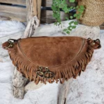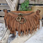 Sac banane en cuir velours au style bohème chic, sublimé par de délicates franges et une fermeture zippée ornée d’anneaux métalliques.