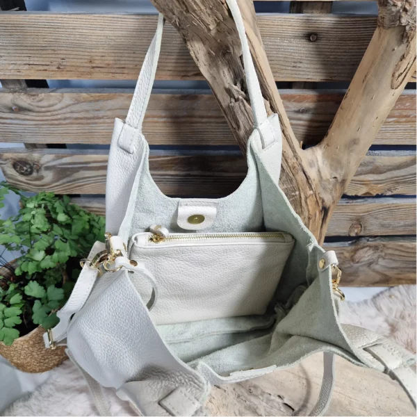 Ce sac en cuir allie élégance et praticité avec ses deux anses courtes et sa bandoulière réglable et amovible, il peut se porter aussi bien à la main, qu’à l’épaule ou croisé. Le sac est accompagné d’une petite pochette zippée assortie, pratique pour ranger de petits objets comme les clés ou de la monnaie. Sa fermeture par bouton aimanté et ses détails métalliques sont en finitions dorées, ajoutant une touche élégante. Un sac polyvalent, parfait pour le quotidien comme pour vos sorties. Sac en cuir pleine fleur finition pigmentée. Cuir de bovin. Pas de doublure intérieure. Cuir de fabrication italienne.