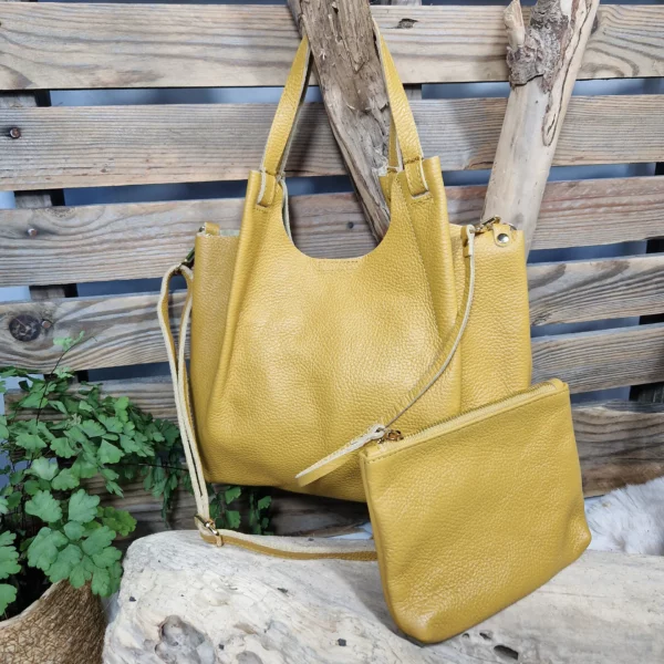 Sac en cuir avec ses anses courtes et sa bandoulière amovible. Une petite pochette zippée assortie et ses détails dorés élégants en font un compagnon pratique et chic pour le quotidien.