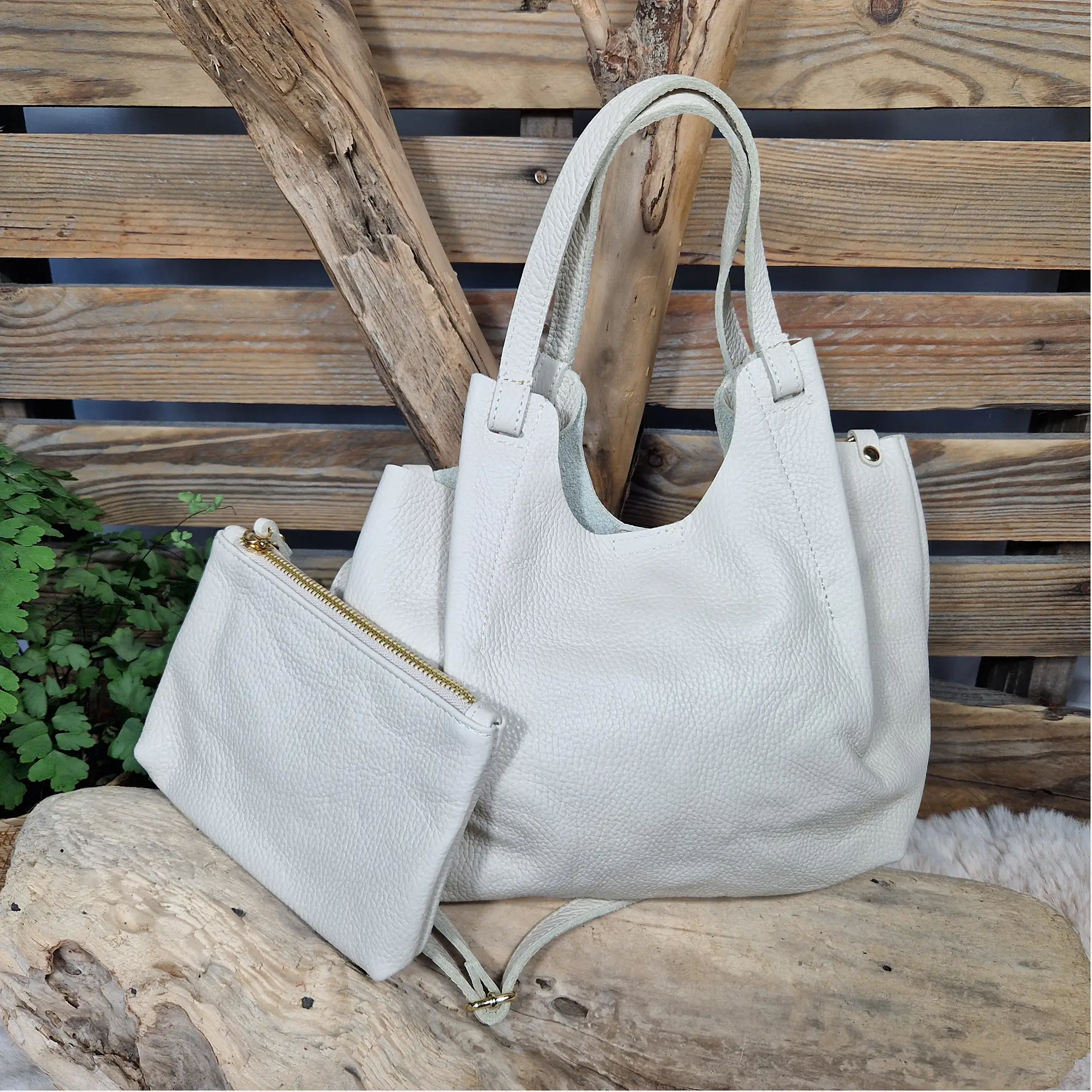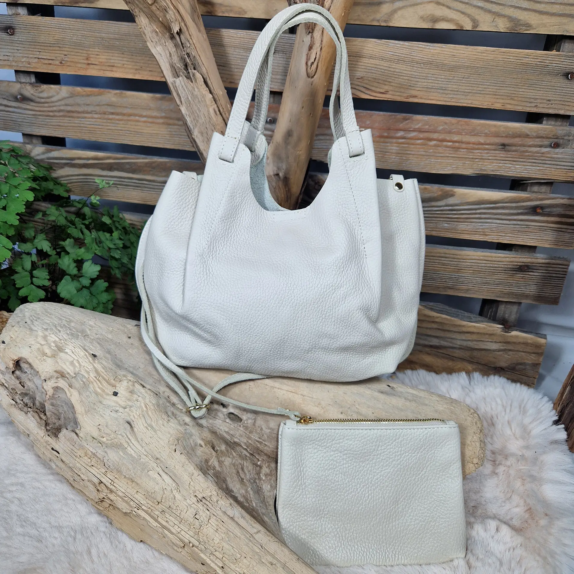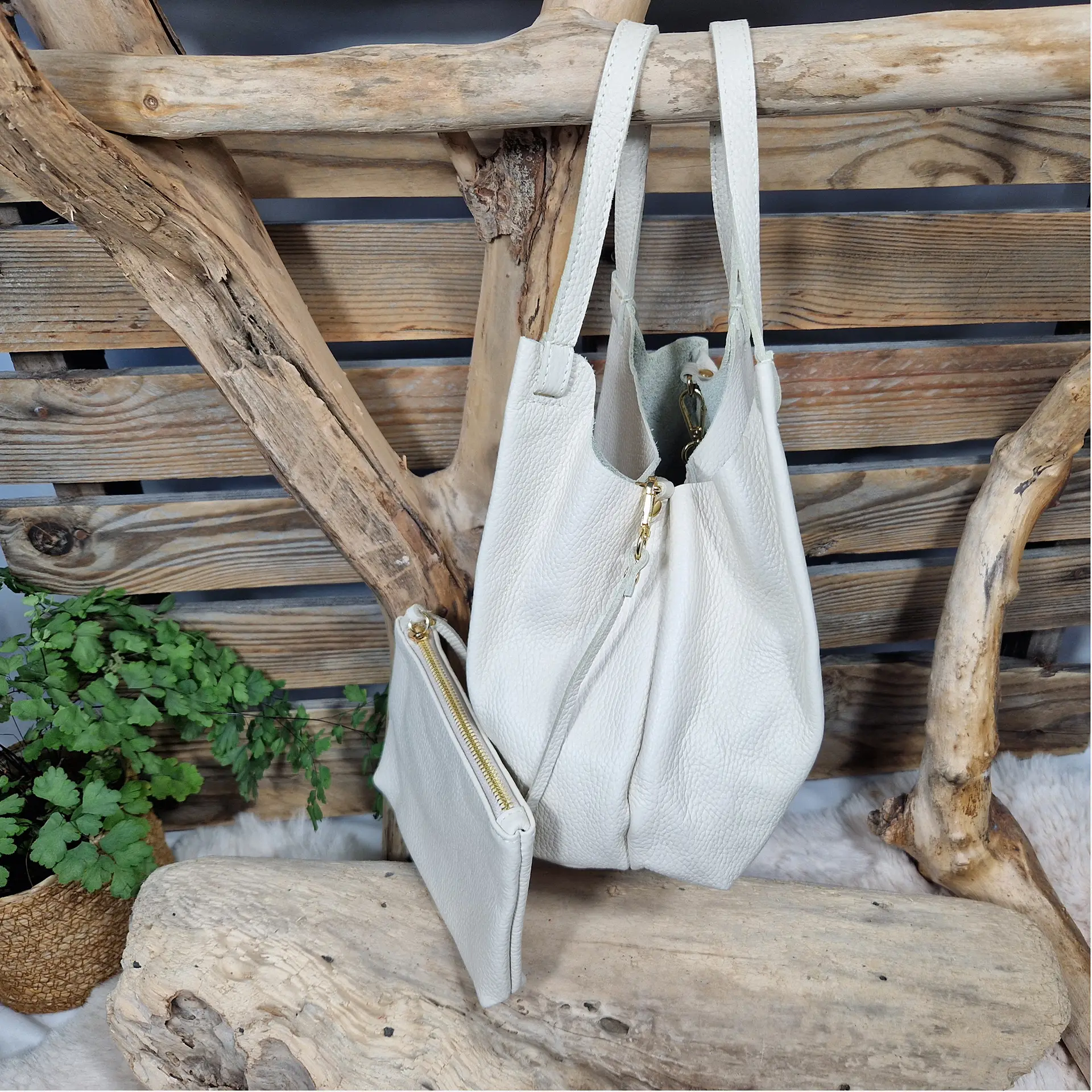 Sac en cuir avec ses anses courtes et sa bandoulière amovible. Une petite pochette zippée assortie et ses détails dorés élégants en font un compagnon pratique et chic pour le quotidien.