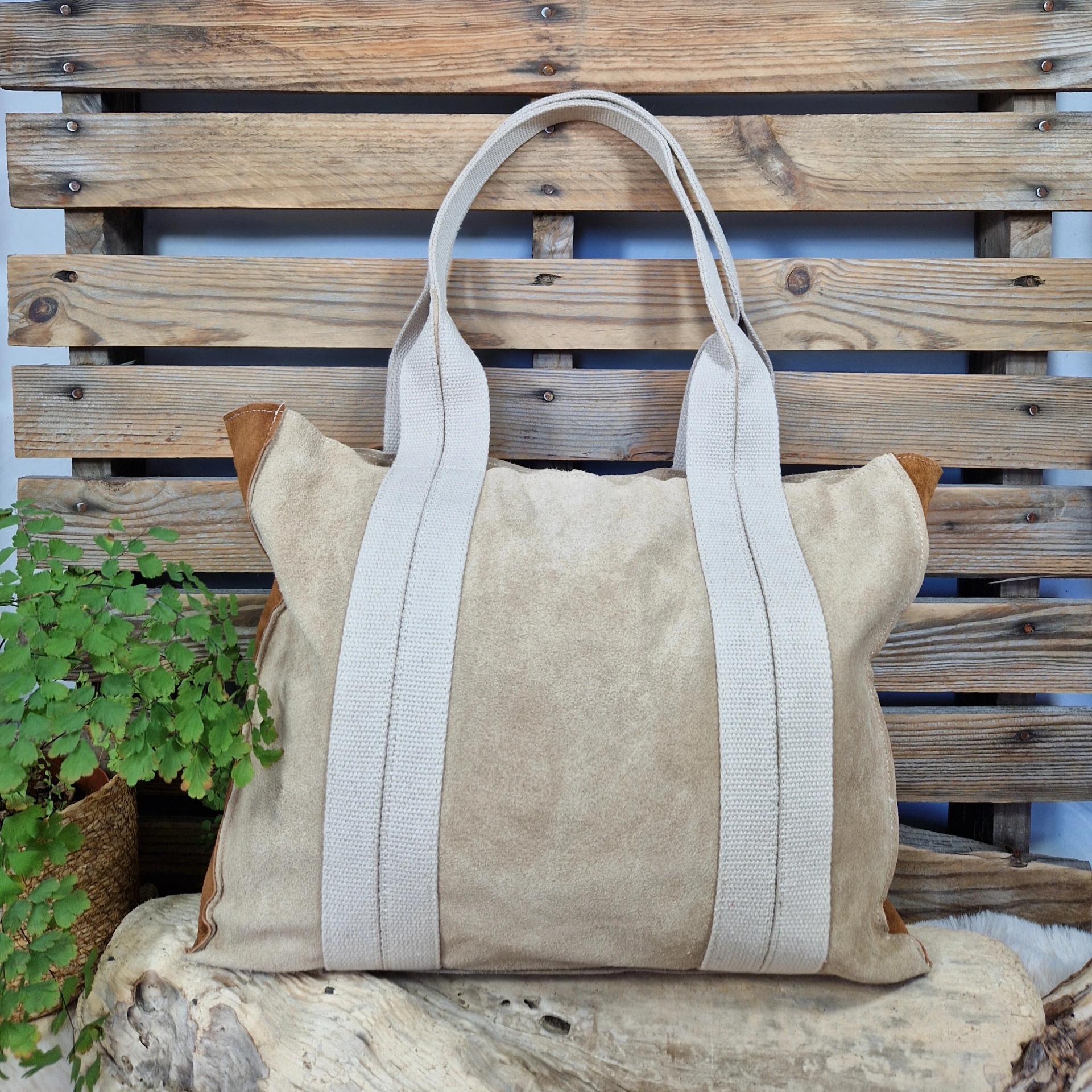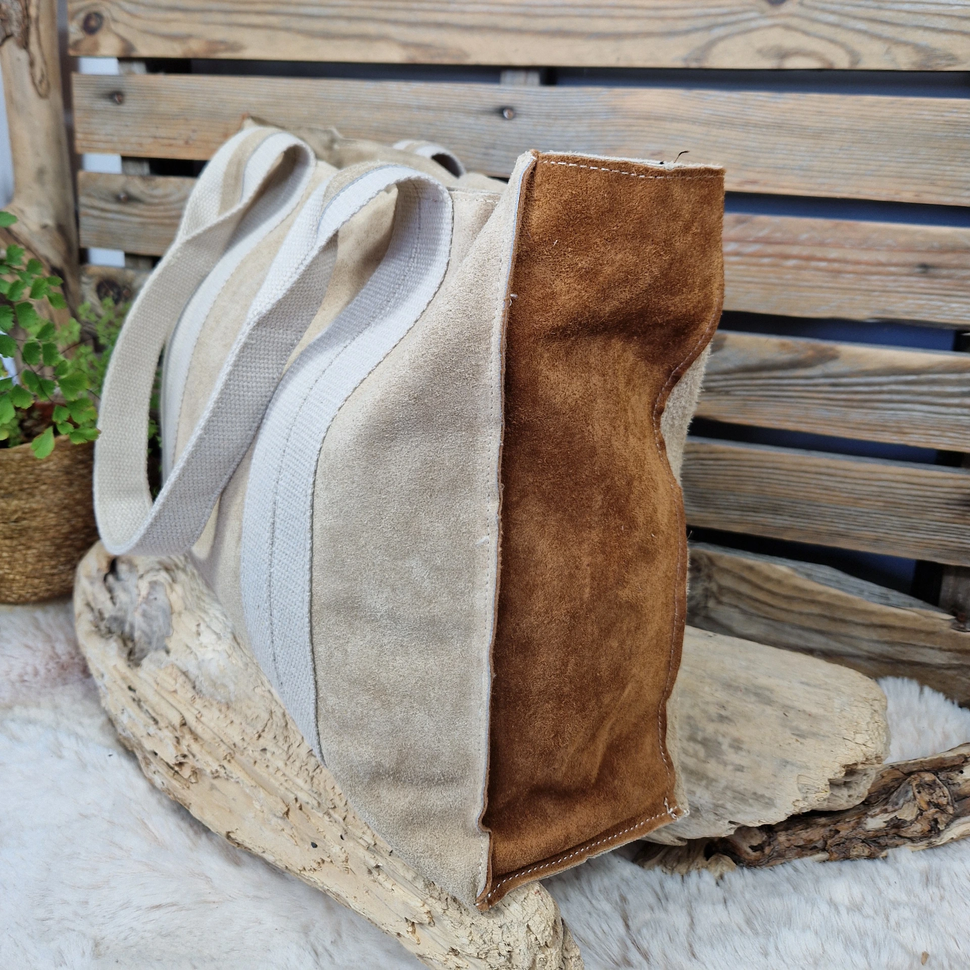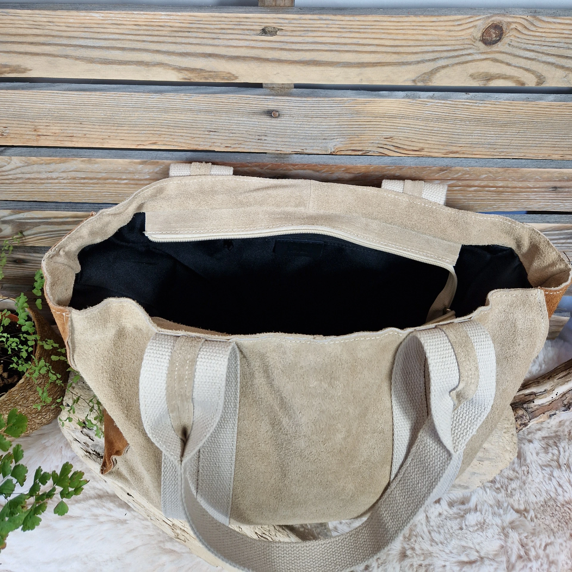 Sac cabas en cuir suédé beige, à la fois élégant et pratique. Sa matière souple, ses anses confortables et son intérieur spacieux avec poche zippée en font l’allié idéal du quotidien.
