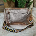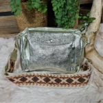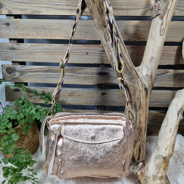 Éclatant et pratique, ce sac en cuir irisé est l’allié parfait pour vos looks du quotidien comme des soirées. Sa large bandoulière tissée à motifs apporte confort et originalité, tandis que ses poches gardent vos essentiels toujours à portée de main.