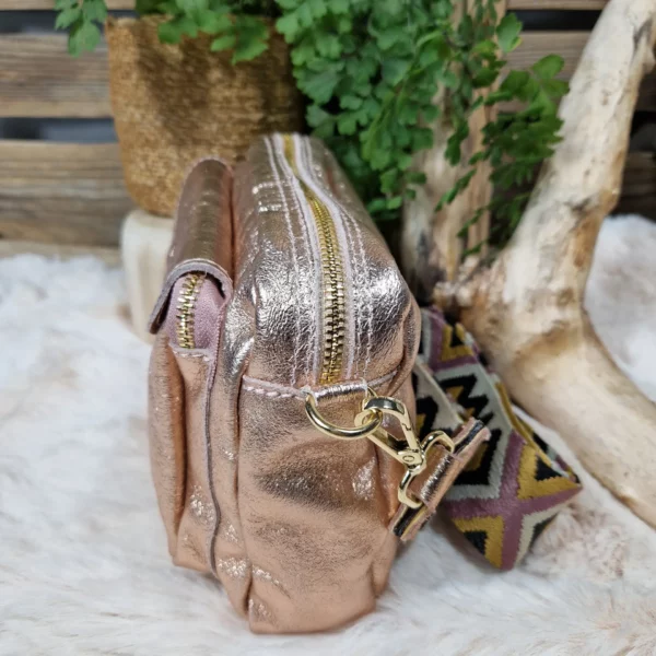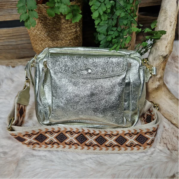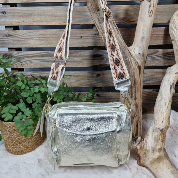 Apportez une touche d’éclat à vos tenues avec ce sac bandoulière en cuir irisé. Son design moderne et sa texture lumineuse en font un accessoire idéal pour dynamiser vos looks, de jour comme de nuit. Sa large bandoulière tissée à motifs géométriques ethniques, apporte un confort optimal et un style unique. Il est pratique et fonctionnel avec sa poche frontale à rabat pression et fermeture zippée principale pour garder vos essentiels en sécurité. Compact mais suffisamment spacieux pour accueillir vos indispensables. Un sac lumineux et original qui allie confort, praticité et style, pour un usage quotidien ou pour sublimer vos sorties en soirée. Sac en croûte de cuir finition enduite. Cuir de bovin. Doublure intérieure en polyester. Cuir de fabrication italienne.