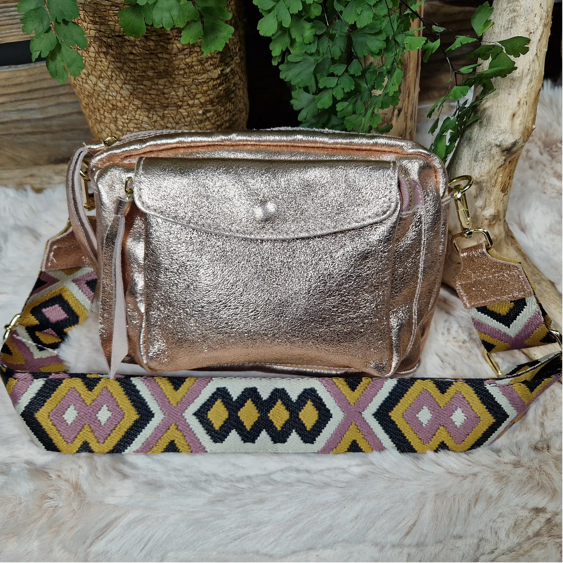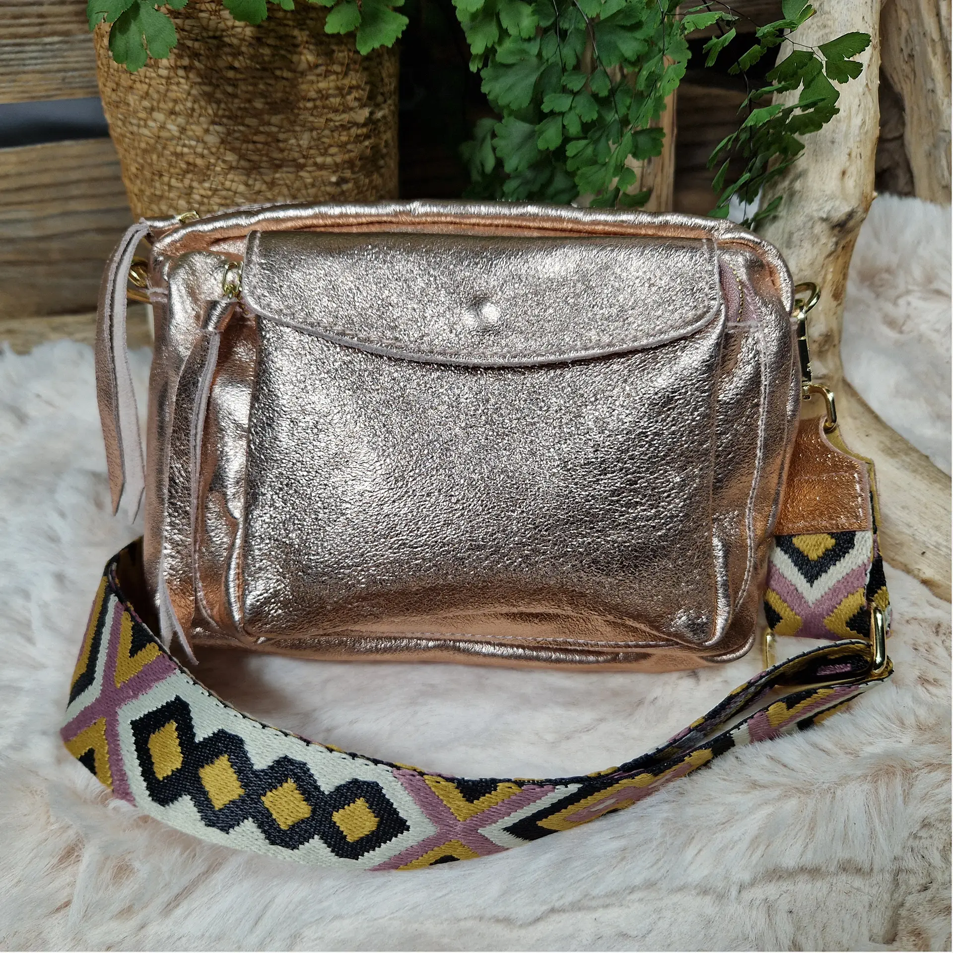 Éclatant et pratique, ce sac en cuir irisé est l’allié parfait pour vos looks du quotidien comme des soirées. Sa large bandoulière tissée à motifs apporte confort et originalité, tandis que ses poches gardent vos essentiels toujours à portée de main.