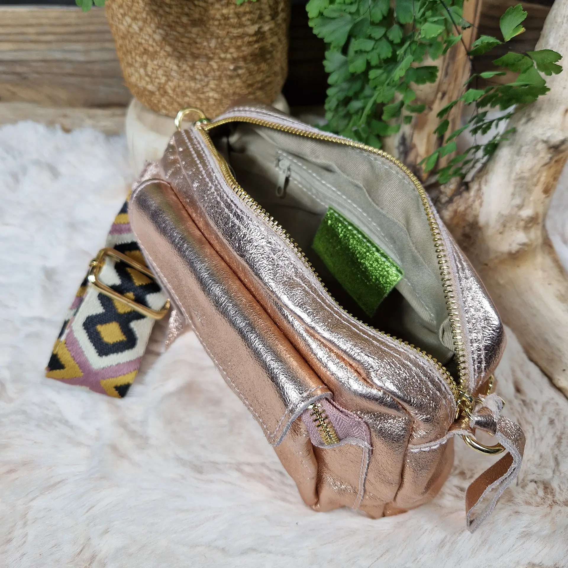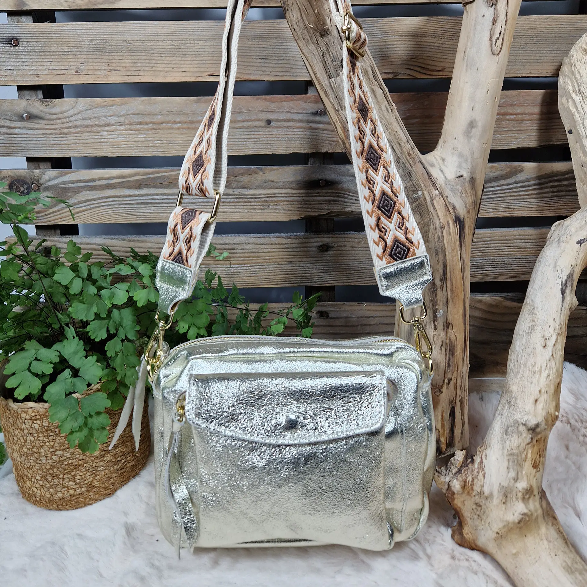 Apportez une touche d’éclat à vos tenues avec ce sac bandoulière en cuir irisé. Son design moderne et sa texture lumineuse en font un accessoire idéal pour dynamiser vos looks, de jour comme de nuit. Sa large bandoulière tissée à motifs géométriques ethniques, apporte un confort optimal et un style unique. Il est pratique et fonctionnel avec sa poche frontale à rabat pression et fermeture zippée principale pour garder vos essentiels en sécurité. Compact mais suffisamment spacieux pour accueillir vos indispensables. Un sac lumineux et original qui allie confort, praticité et style, pour un usage quotidien ou pour sublimer vos sorties en soirée. Sac en croûte de cuir finition enduite. Cuir de bovin. Doublure intérieure en polyester. Cuir de fabrication italienne.