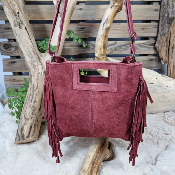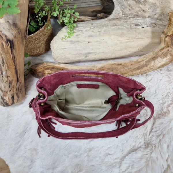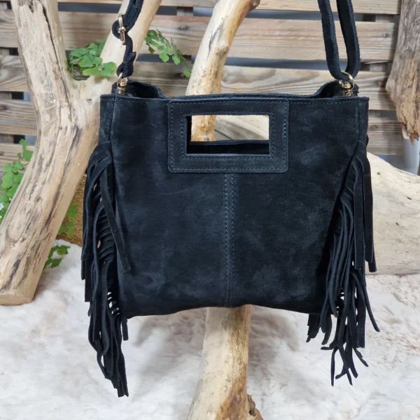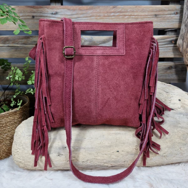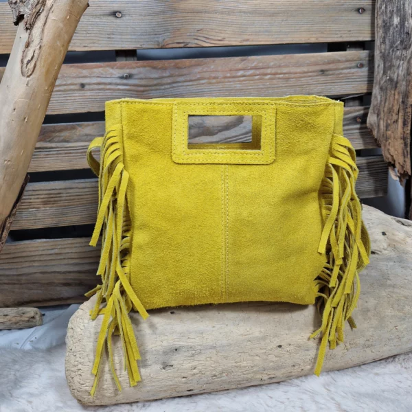 Sac au style bohème chic, réalisé en cuir velours doux avec des franges qui apportent du caractère. Parfait pour une touche d’originalité.
