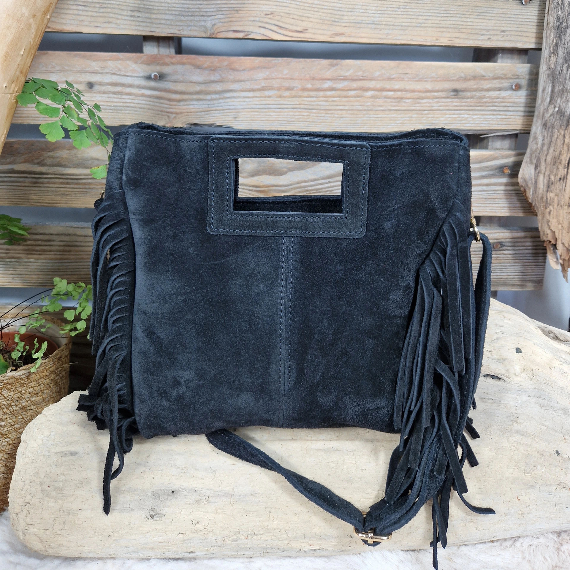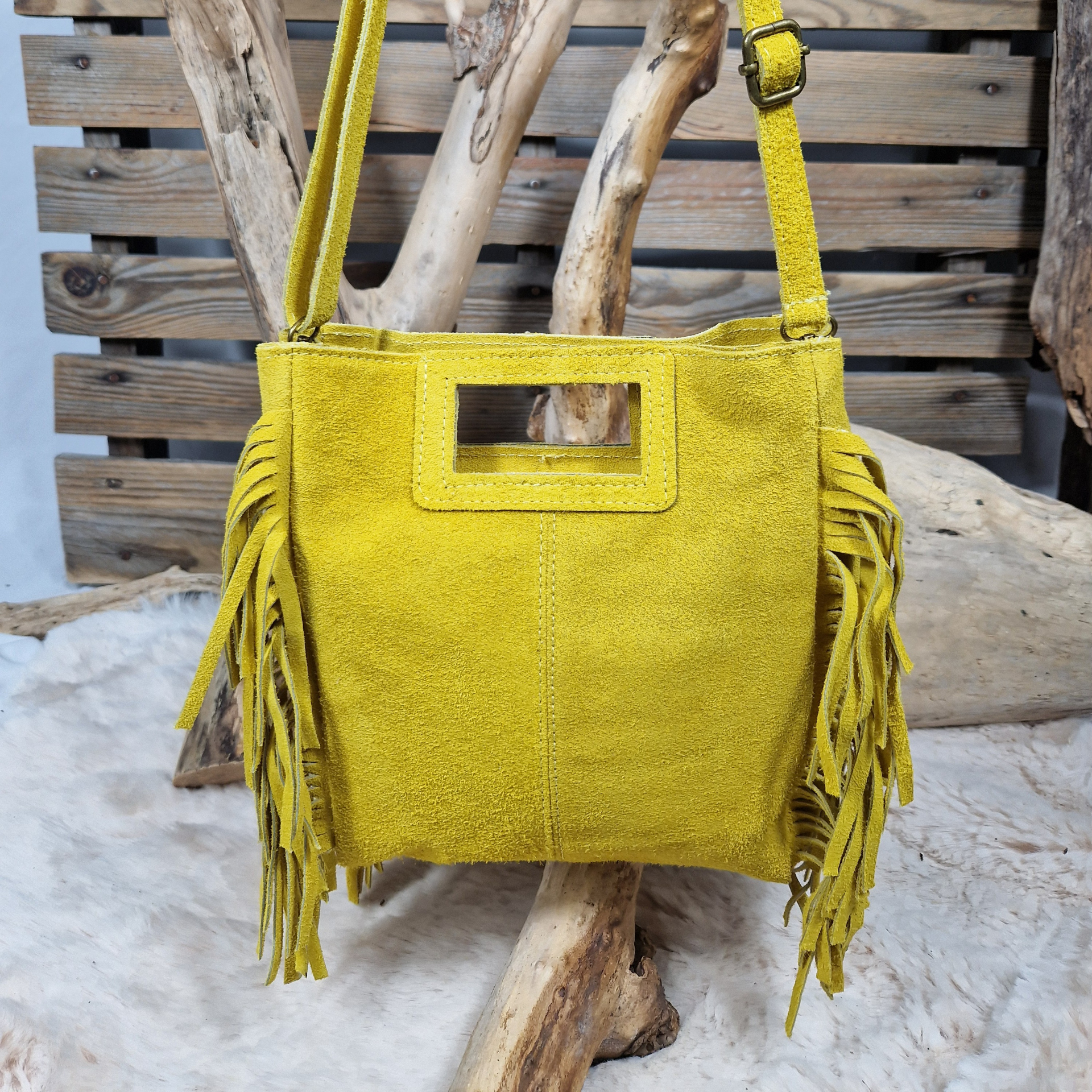 Sac au style bohème chic, réalisé en cuir velours doux avec des franges qui apportent du caractère. Parfait pour une touche d’originalité.