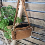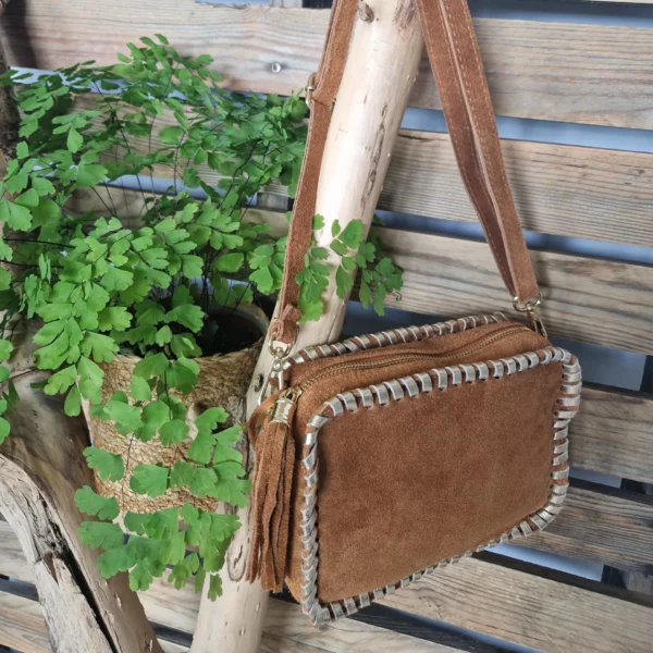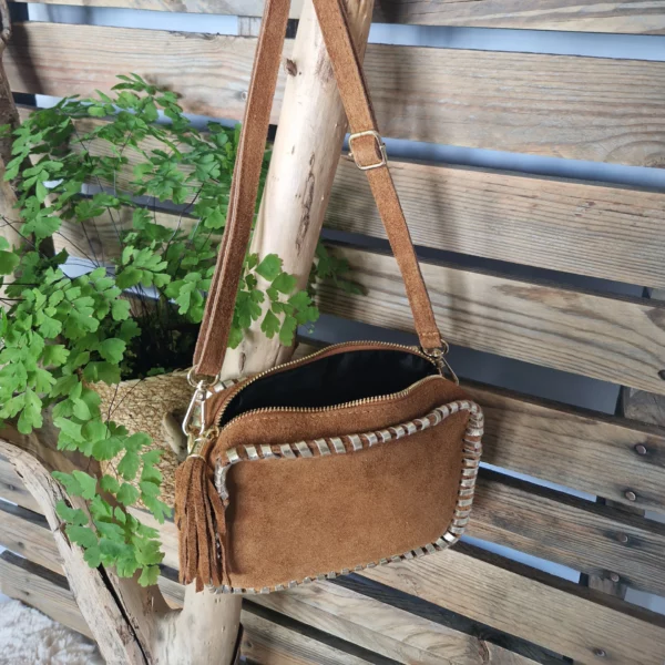 Ce sac en cuir velours est l’allié parfait pour un look à la fois bohème et élégant. Son design rectangulaire met en valeur un cuir doux au toucher, rehaussé de finitions tressées avec un ruban en cuir métallisé qui lui apporte une note moderne et raffinée. Pratique et tendance, il dispose d’une fermeture zippée sécurisée, d’une bandoulière réglable assortie pour un porté épaule ou croisé, ainsi que d’un pompon décoratif qui ajoute une touche de caractère. Son compartiment intérieur possède une poche plate zippée. Un accessoire incontournable pour sublimer vos tenues, du matin jusqu’au soir. Sac en croûte de cuir finition velours. Cuir de bovin. Doublure intérieure en polyamide. Cuir de fabrication italienne.