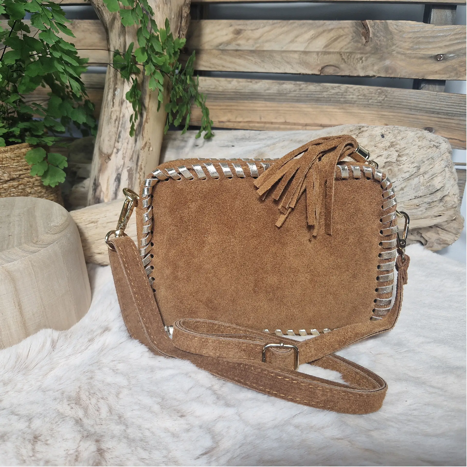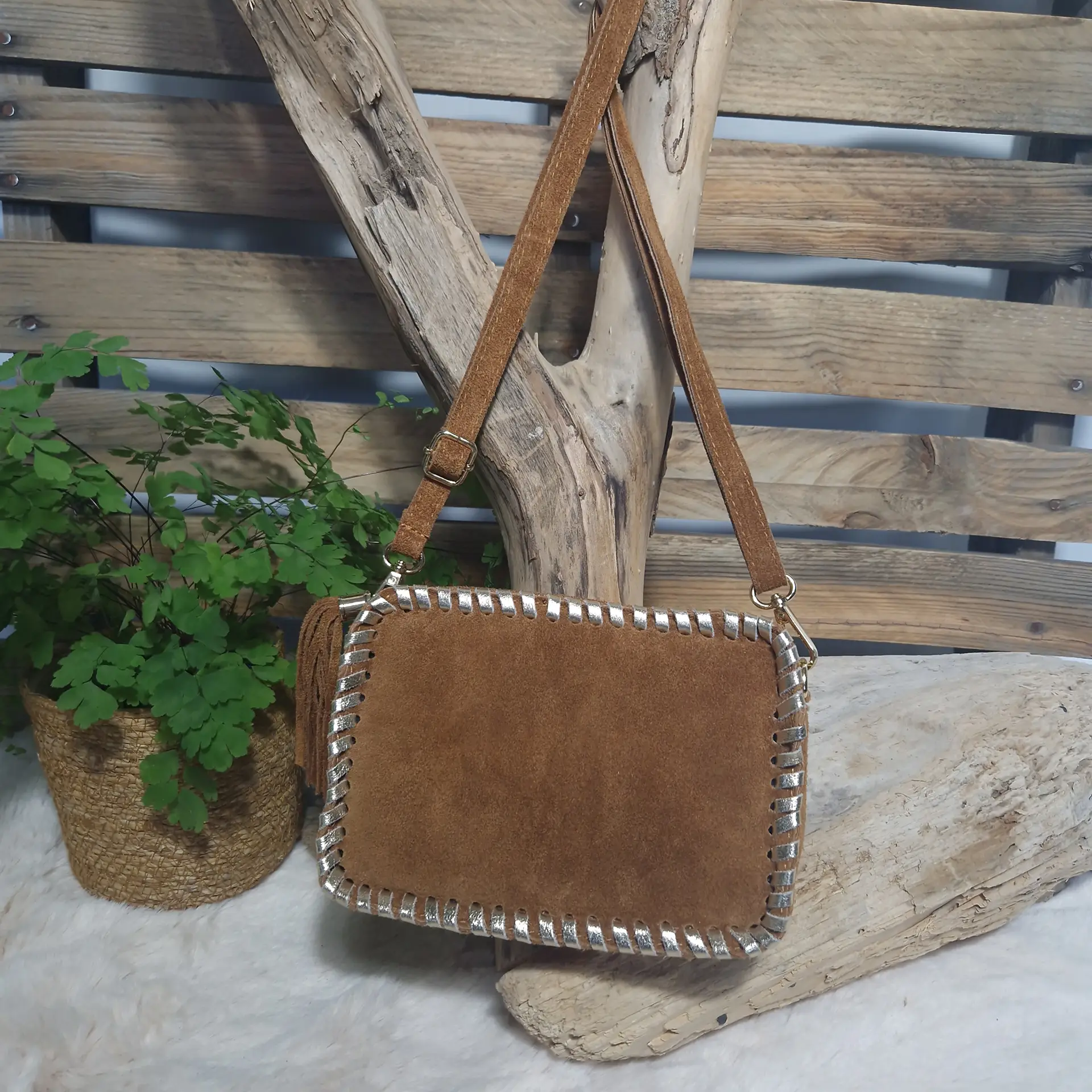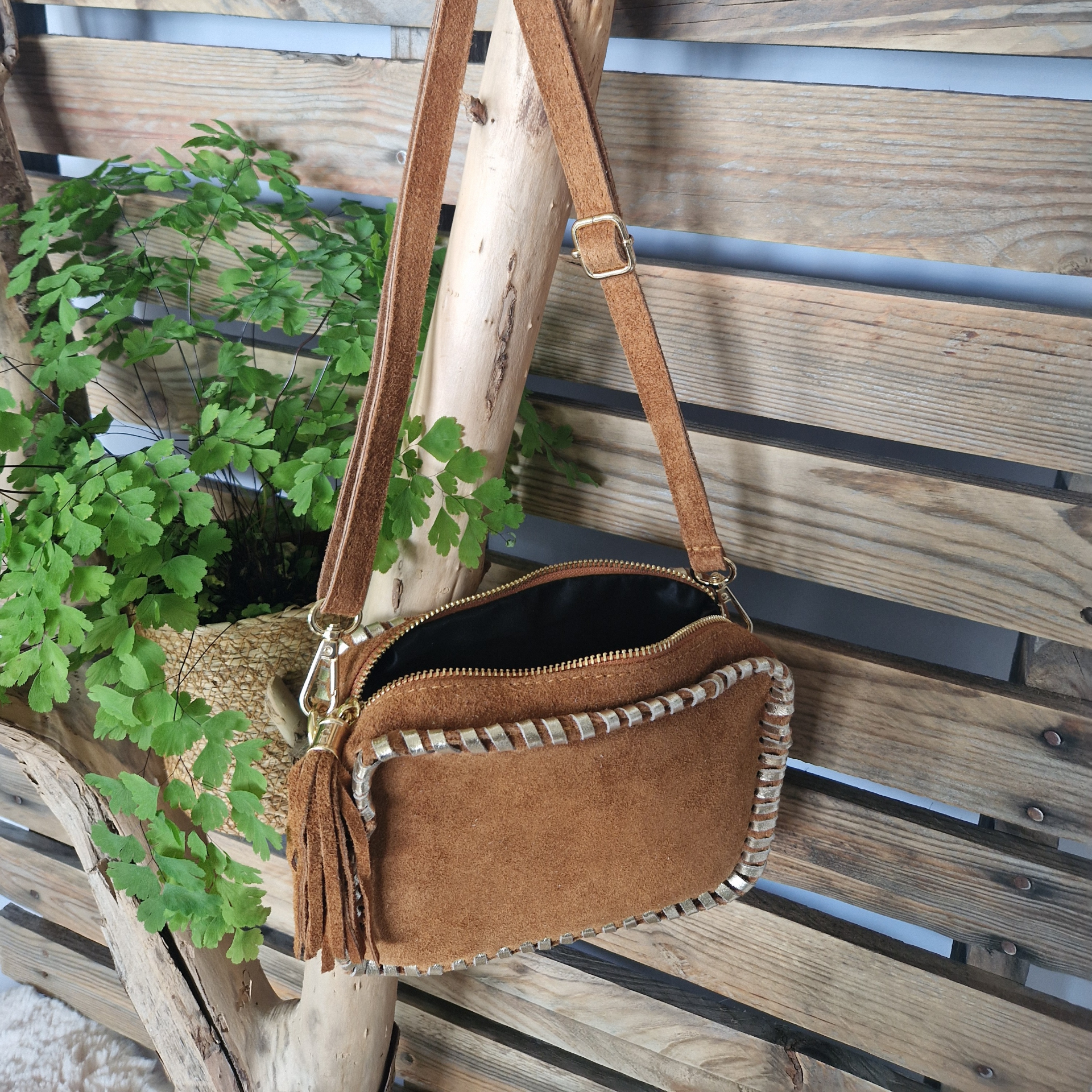 Ce sac en cuir velours est l’allié parfait pour un look à la fois bohème et élégant. Son design rectangulaire met en valeur un cuir doux au toucher, rehaussé de finitions tressées avec un ruban en cuir métallisé qui lui apporte une note moderne et raffinée. Pratique et tendance, il dispose d’une fermeture zippée sécurisée, d’une bandoulière réglable assortie pour un porté épaule ou croisé, ainsi que d’un pompon décoratif qui ajoute une touche de caractère. Son compartiment intérieur possède une poche plate zippée. Un accessoire incontournable pour sublimer vos tenues, du matin jusqu’au soir. Sac en croûte de cuir finition velours. Cuir de bovin. Doublure intérieure en polyamide. Cuir de fabrication italienne.