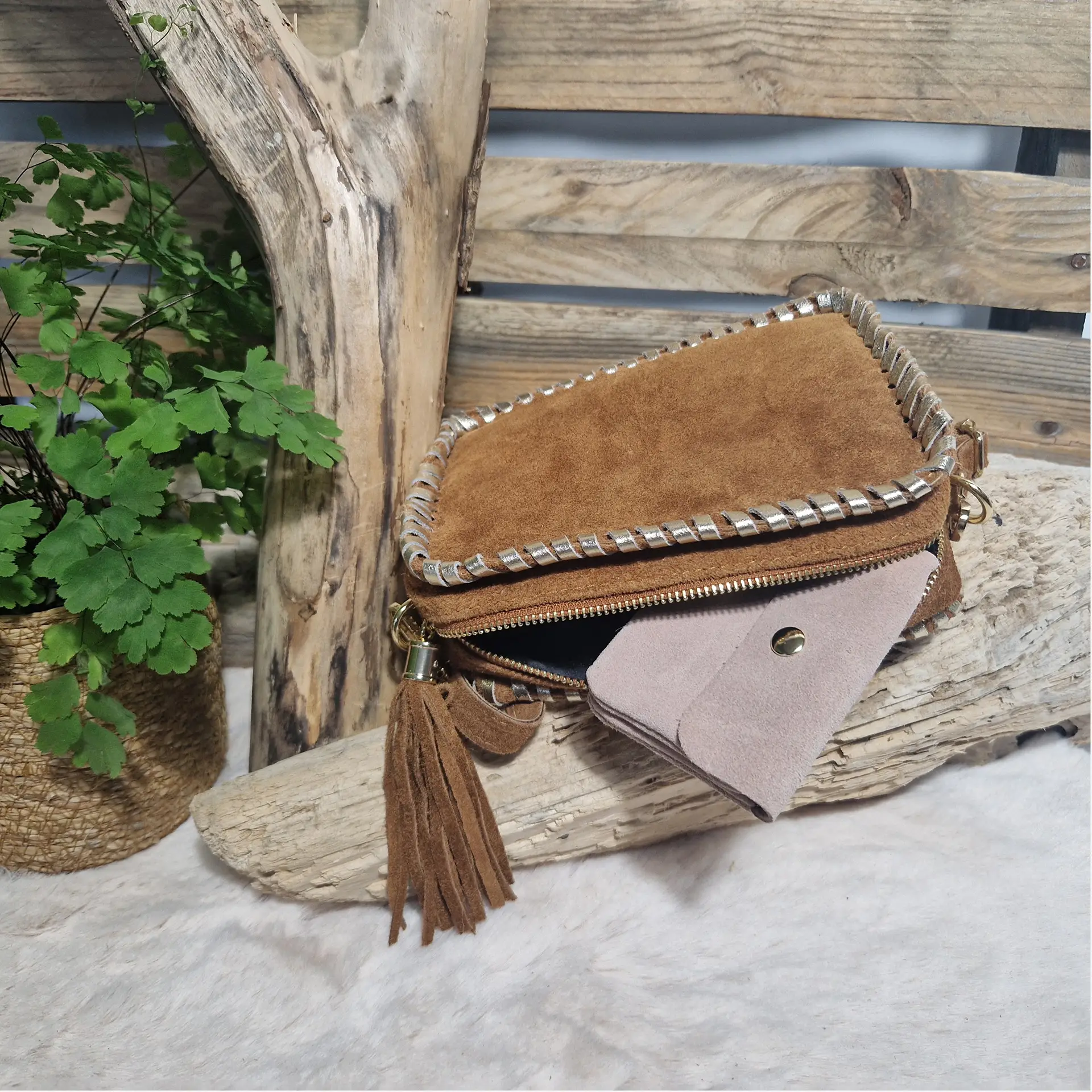 Compact et élégant, ce sac en cuir velours se distingue par ses finitions tressées métallisées et son pompon décoratif. L’accessoire idéal pour garder vos essentiels à portée de main avec style.