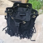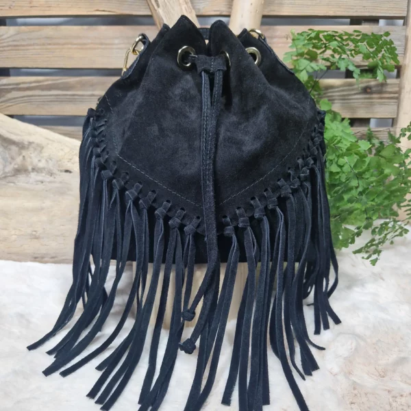 Sac seau en cuir velours avec franges au style bohème chic, pratique et tendance. Fermeture par lien coulissant et bandoulière réglable. Un indispensable facile à assortir!