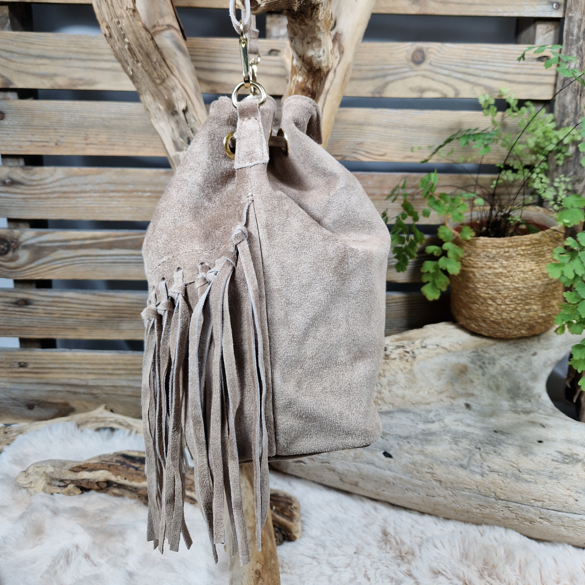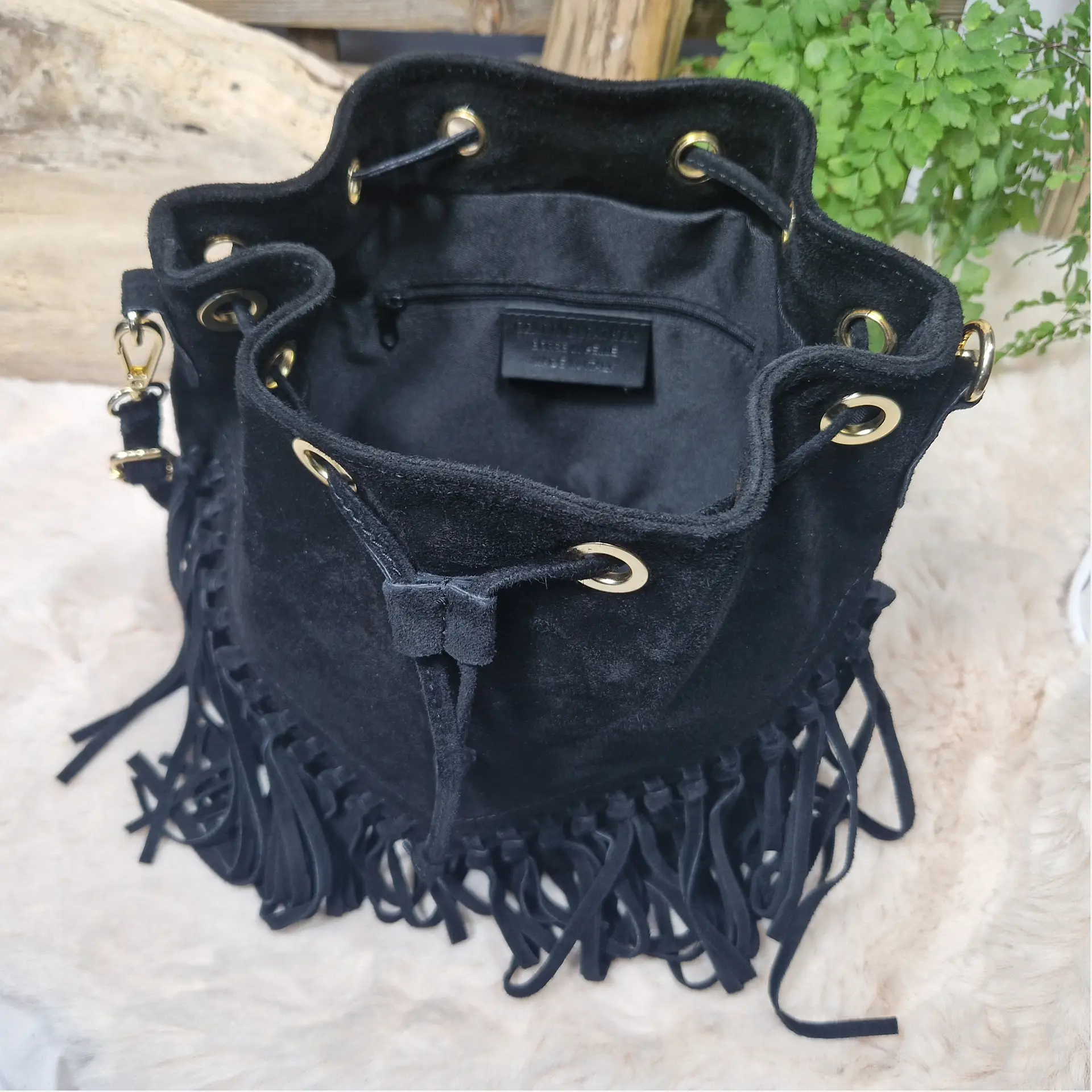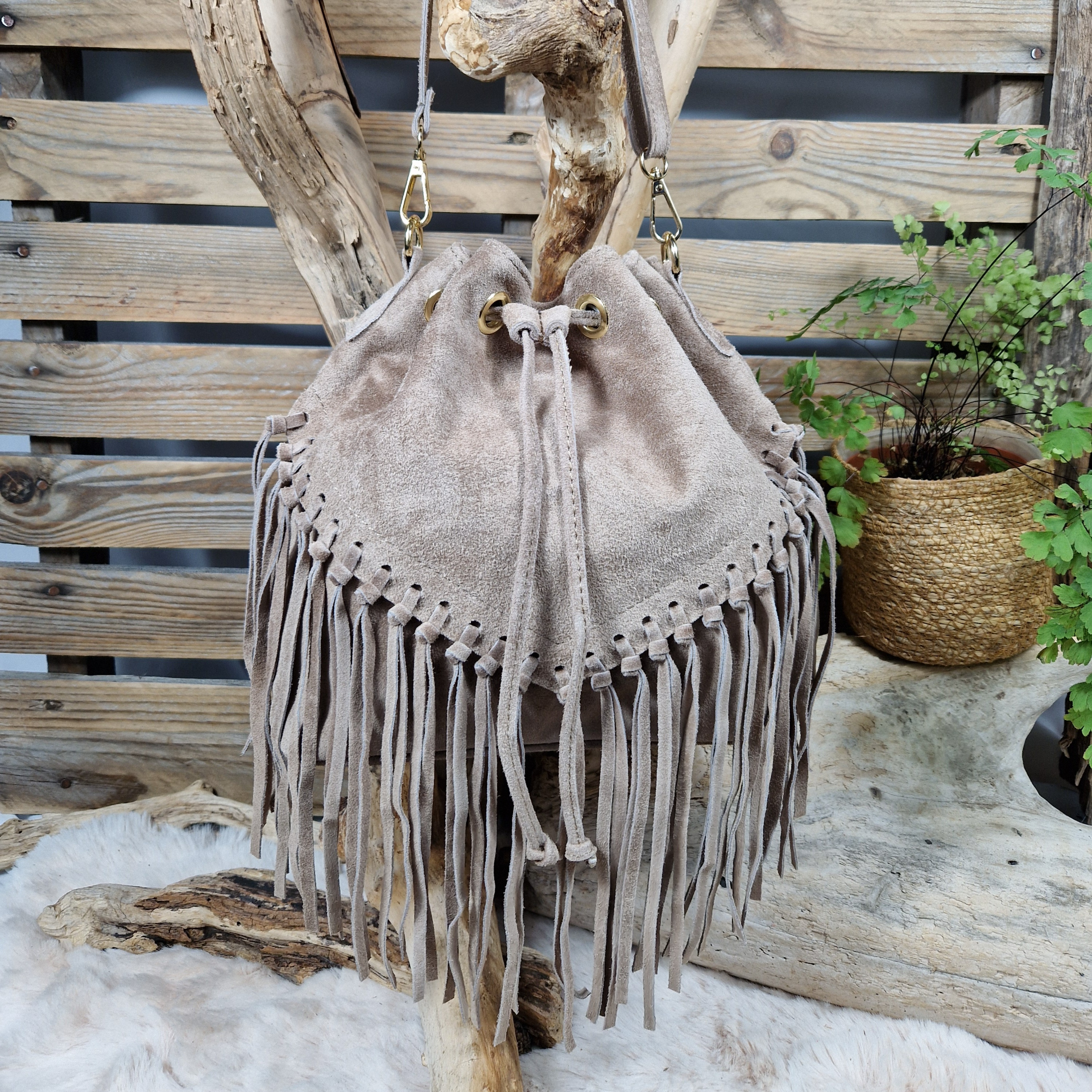Sac seau en cuir velours avec franges au style bohème chic, pratique et tendance. Fermeture par lien coulissant et bandoulière réglable. Un indispensable facile à assortir!