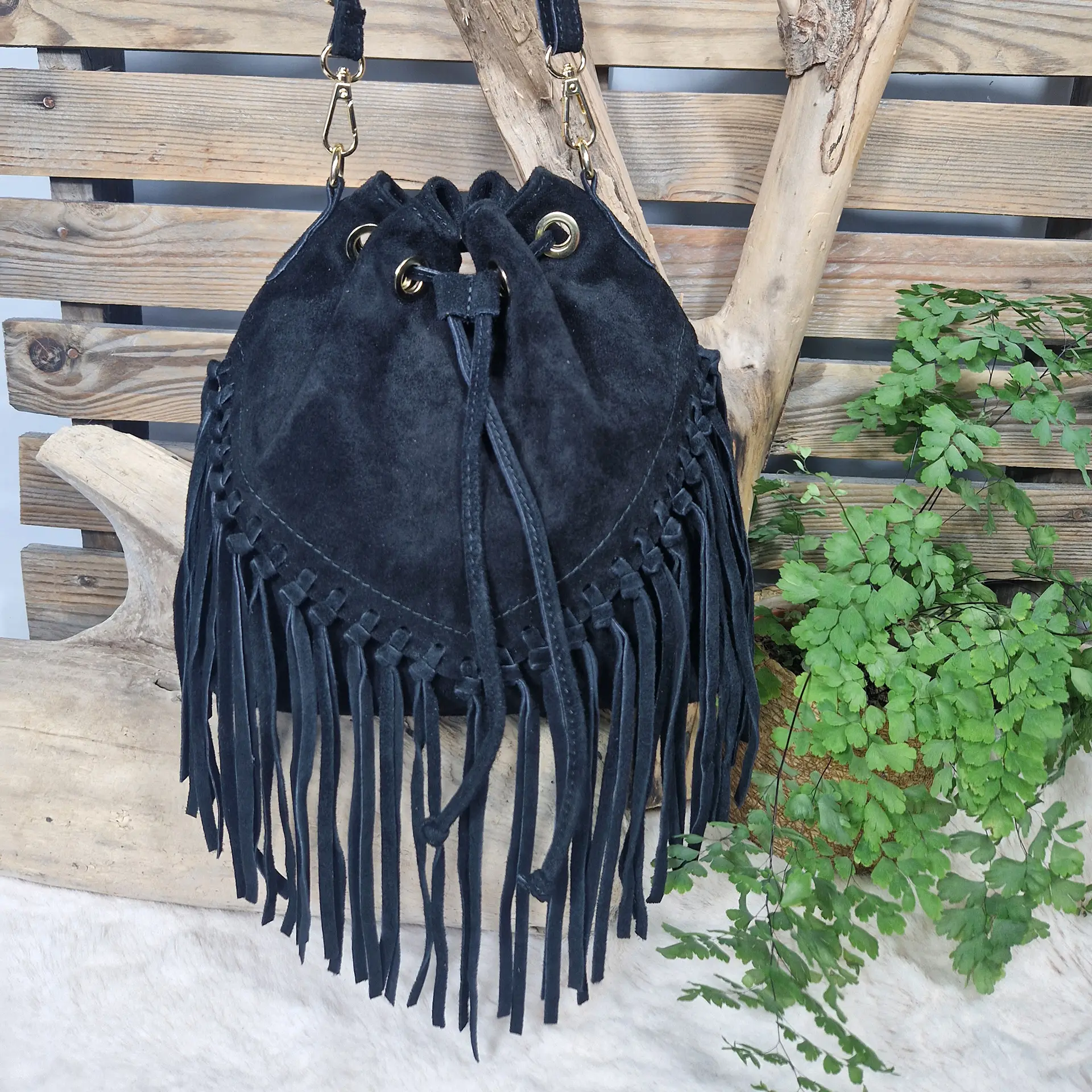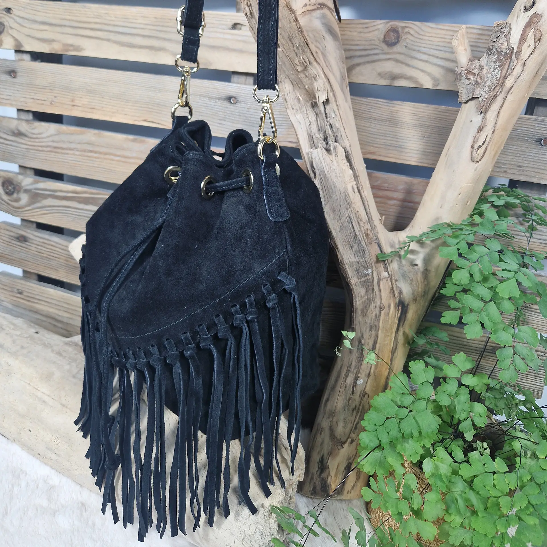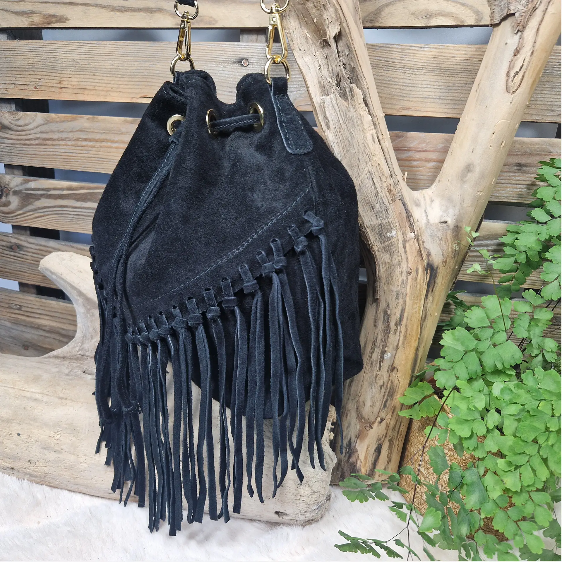 Sac seau en cuir velours avec franges au style bohème chic, pratique et tendance. Fermeture par lien coulissant et bandoulière réglable. Un indispensable facile à assortir!