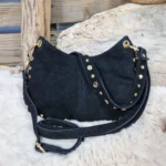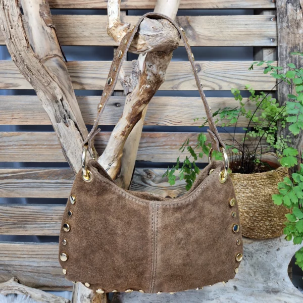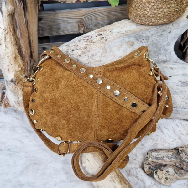 Sac en cuir velours, au style bohème et tendance. Orné de rivets métalliques dorés, il apporte une touche de caractère tout en restant élégant.