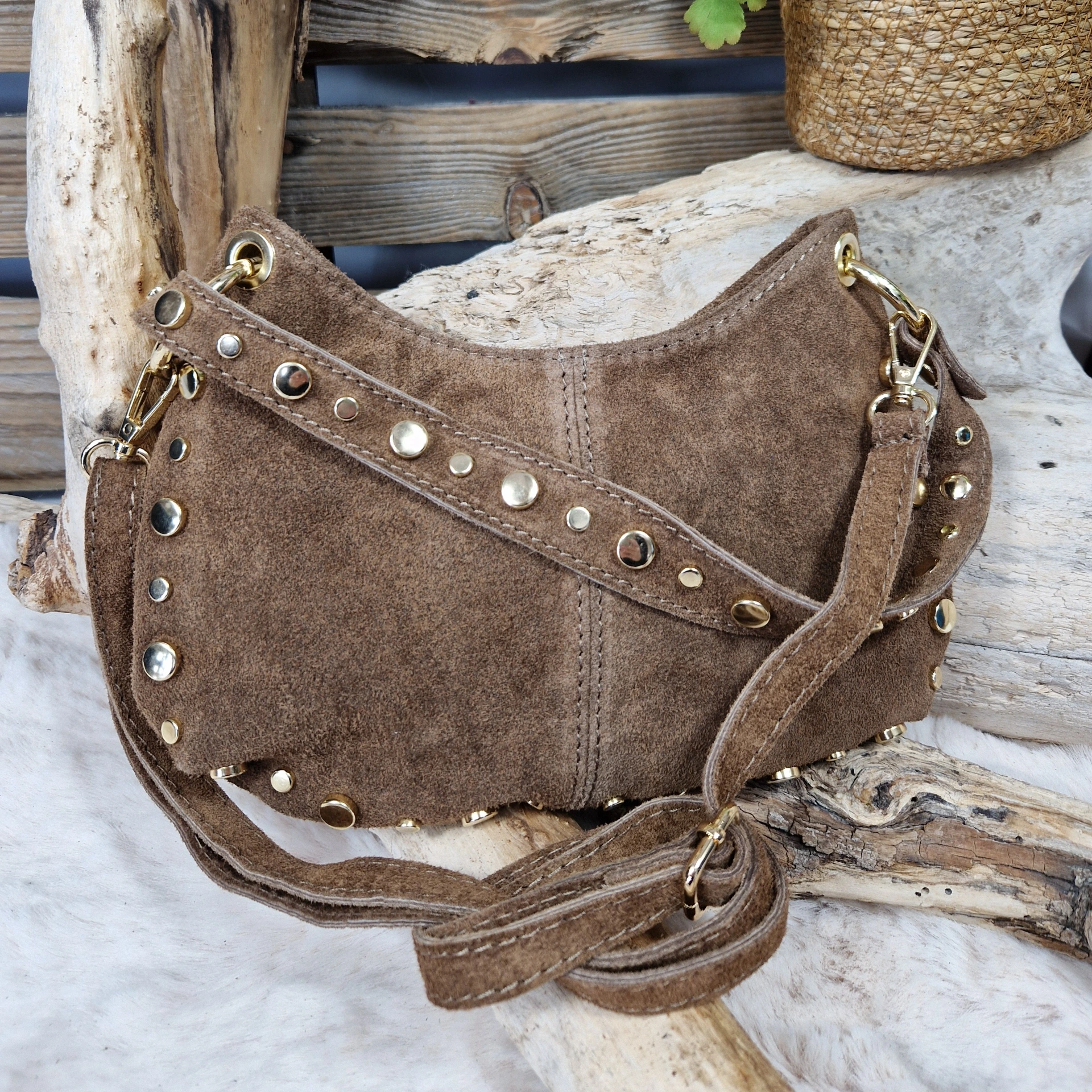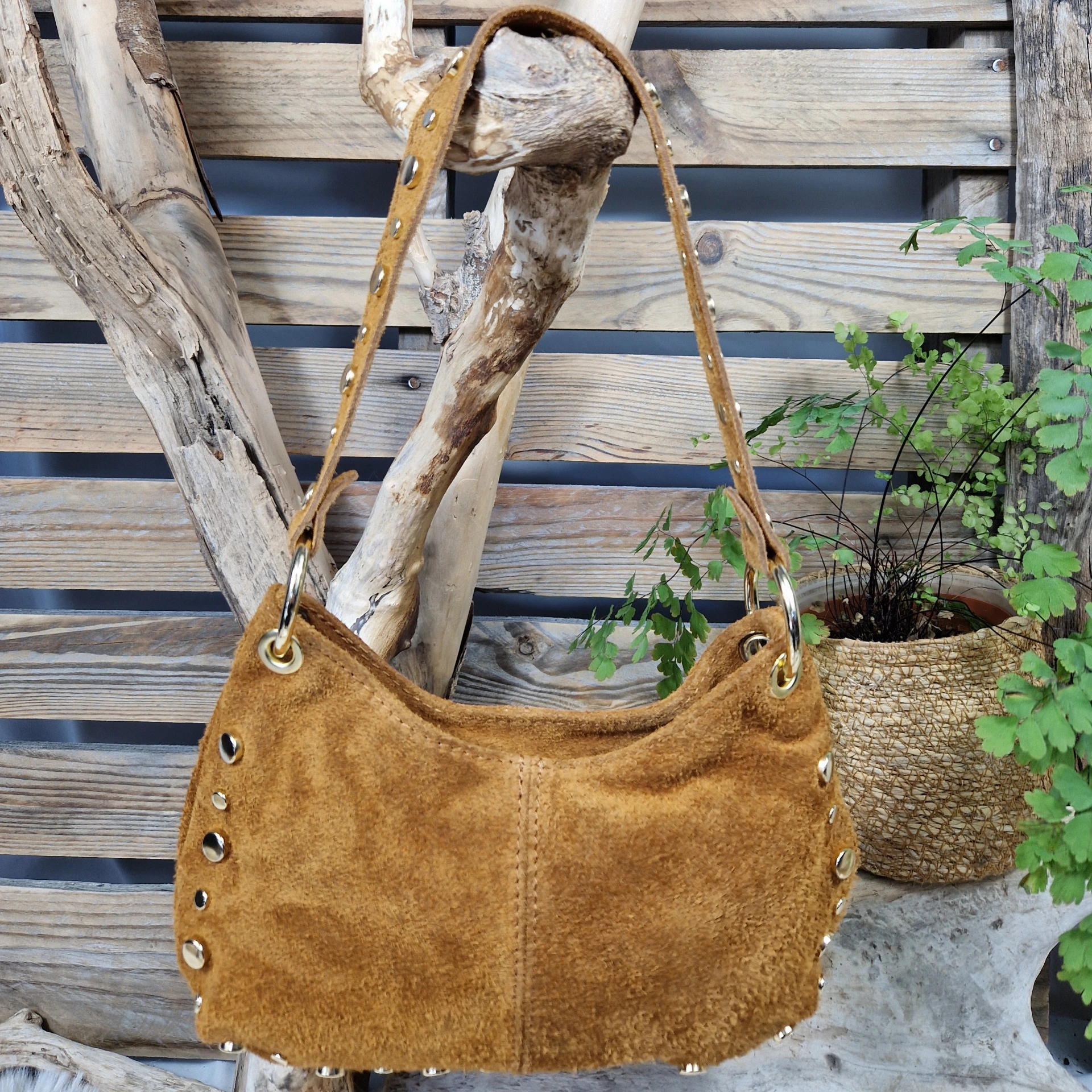Sac en cuir velours, au style bohème et tendance. Orné de rivets métalliques dorés, il apporte une touche de caractère tout en restant élégant.